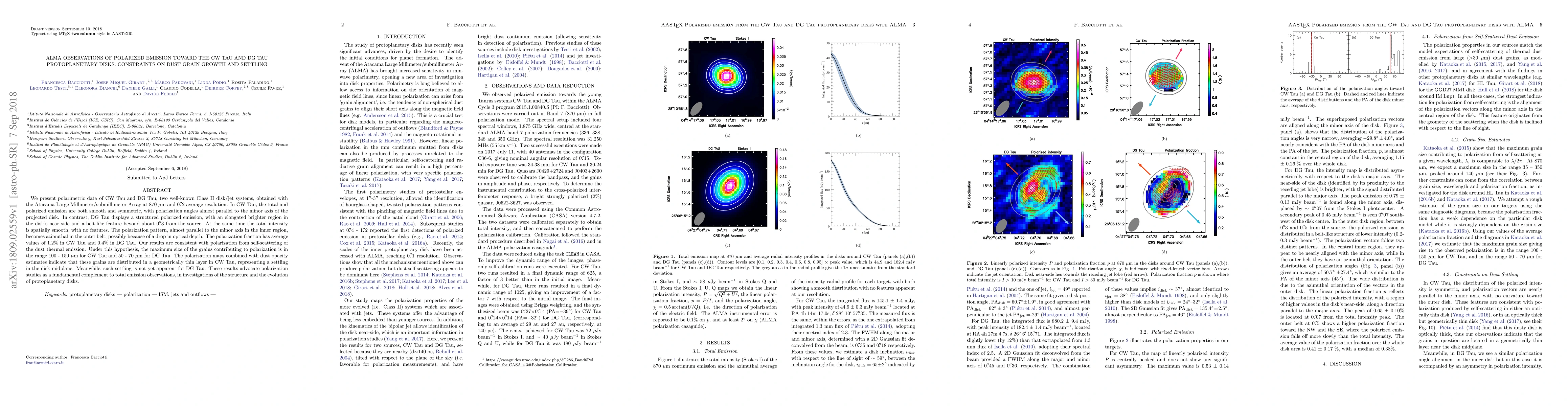 ALMA observations of CW Tau and DG Tau reveal polarized emission patterns that provide insights into dust grain growth and settling in protoplanetary disks. CW Tau shows smooth, symmetric polarization suggesting grain sizes of 100-150 µm and settling in the disk midplane, while DG Tau's structured polarization indicates smaller grains (50-70 µm) and no evident settling yet.