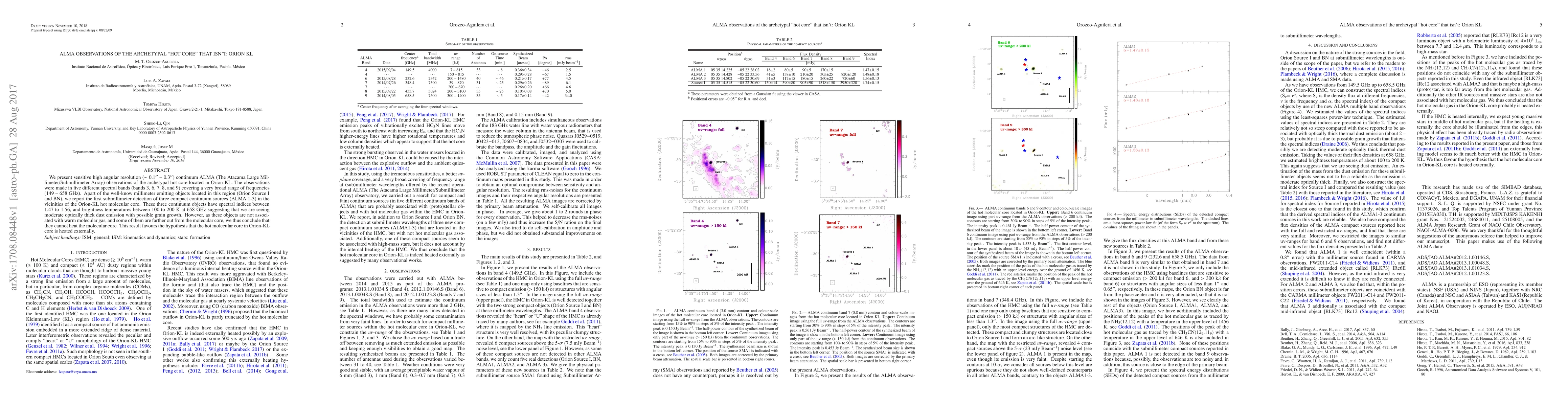 We present sensitive high angular resolution ($\sim$ 0.1$''$ -- 0.3$''$) continuum ALMA (The Atacama Large Millimeter/Submillimeter Array) observations of the archetypal hot core located in Orion-KL. The observations were made in five different spectral bands (bands 3, 6, 7, 8, and 9) covering a very broad range of frequencies (149 -- 658 GHz). Apart of the well-know millimeter emitting objects located in this region (Orion Source I and BN), we report the first submillimeter detection of three compact continuum sources (ALMA 1-3) in the vicinities of the Orion-KL hot molecular core. These three continuum objects have spectral indices between 1.47 to 1.56, and brightness temperatures between 100 to 200 K at 658 GHz suggesting that we are seeing moderate optically thick dust emission with possible grain growth. However, as these objects are not associated with warm molecular gas, and some of them are farther out from the molecular core, we thus conclude that they cannot heat the molecular core. This result favours the hypothesis that the hot molecular core in Orion-KL core is heated externally.