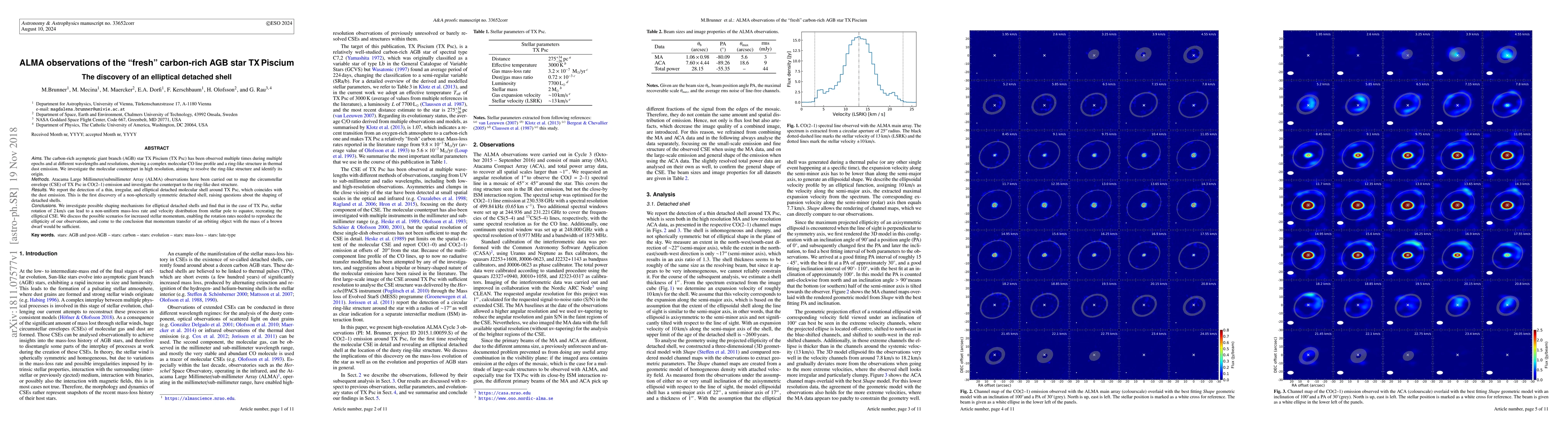 Aims. The carbon-rich asymptotic giant branch (AGB) star TX Piscium (TX Psc) has been observed multiple times during multiple epochs and at different wavelengths and resolutions, showing a complex molecular CO line profile and a ring-like structure in thermal dust emission. We investigate the molecular counterpart in high resolution, aiming to resolve the ring-like structure and identify its origin. Methods. Atacama Large Millimeter/submillimeter Array (ALMA) observations have been carried out to map the circumstellar envelope (CSE) of TX Psc in CO(2-1) emission and investigate the counterpart to the ring-like dust structure. Results. We report the detection of a thin, irregular, and elliptical detached molecular shell around TX Psc, which coincides with the dust emission. This is the first discovery of a non-spherically symmetric detached shell, raising questions about the shaping of detached shells. Conclusions. We investigate possible shaping mechanisms for elliptical detached shells and find that in the case of TX Psc, stellar rotation of 2 km/s can lead to a non-uniform mass-loss rate and velocity distribution from stellar pole to equator, recreating the elliptical CSE. We discuss the possible scenarios for increased stellar momentum, enabling the rotation rates needed to reproduce the ellipticity of our observations, and come to the conclusion that momentum transfer of an orbiting object with the mass of a brown dwarf would be sufficient.