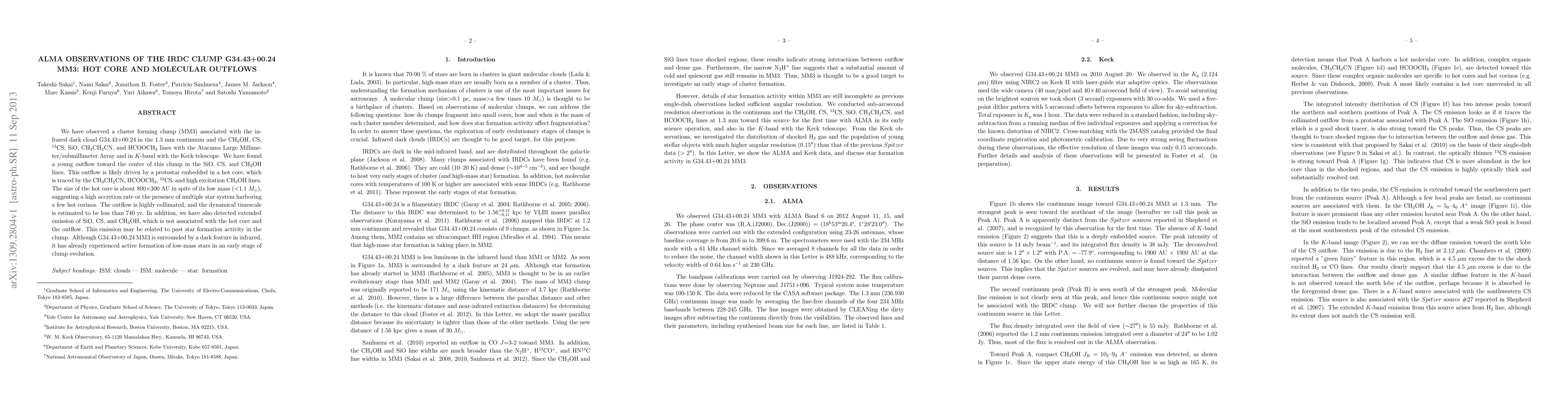 We have observed a cluster forming clump (MM3) associated with the infrared dark cloud G34.43+00.24 in the 1.3 mm continuum and the CH3OH, CS, 13CS, SiO, CH3CH2CN, and HCOOCH3 lines with the Atacama Large Millimeter/submillimeter Array and in K-band with the Keck telescope. We have found a young outflow toward the center of this clump in the SiO, CS, and CH3OH lines. This outflow is likely driven by a protostar embedded in a hot core, which is traced by the CH3CH2CN, HCOOCH3, 13CS, and high excitation CH3OH lines. The size of the hot core is about 800 x 300 AU in spite of its low mass (<1.1 M_sun), suggesting a high accretion rate or the presence of multiple star system harboring a few hot corinos. The outflow is highly collimated, and the dynamical timescale is estimated to be less than 740 yr. In addition, we have also detected extended emission of SiO, CS, and CH3OH, which is not associated with the hot core and the outflow. This emission may be related to past star formation activity in the clump. Although G34.43+00.24 MM3 is surrounded by a dark feature in infrared, it has already experienced active formation of low-mass stars in an early stage of clump evolution.