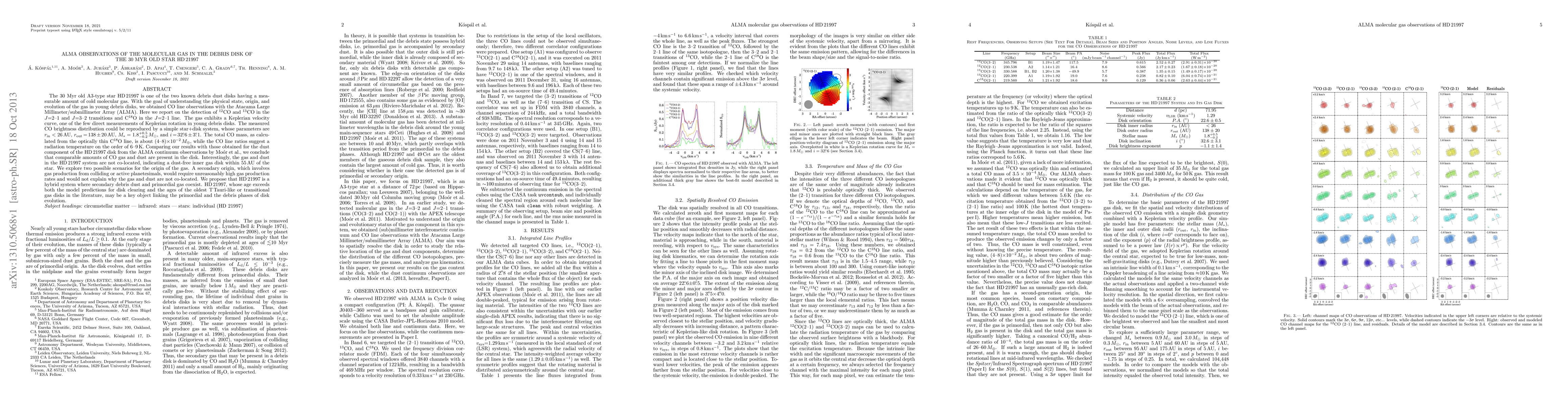 The 30 Myr old A3-type star HD 21997 is one of the two known debris dust disks having a measurable amount of cold molecular gas. With the goal of understanding the physical state, origin, and evolution of the gas in young debris disks, we obtained CO line observations with the Atacama Large Millimeter/submillimeter Array (ALMA). Here we report on the detection of 12CO and 13CO in the J=2-1 and J=3-2 transitions and C18O in the J=2-1 line. The gas exhibits a Keplerian velocity curve, one of the few direct measurements of Keplerian rotation in young debris disks. The measured CO brightness distribution could be reproduced by a simple star+disk system, whose parameters are r_in < 26 AU, r_out = 138 +/- 20 AU, M_*=1.8 +0.5 -0.2 M_Sun, and i = 32.6 +/- 3.1 degrees. The total CO mass, as calculated from the optically thin C18O line, is about (4-8) x 10^-2 M_Earth, while the CO line ratios suggest a radiation temperature on the order of 6-9 K. Comparing our results with those obtained for the dust component of the HD 21997 disk from the ALMA continuum observations by Mo\'or et al., we conclude that comparable amounts of CO gas and dust are present in the disk. Interestingly, the gas and dust in the HD 21997 system are not co-located, indicating a dust-free inner gas disk within 55 AU of the star. We explore two possible scenarios for the origin of the gas. A secondary origin, which involves gas production from colliding or active planetesimals, would require unreasonably high gas production rates and would not explain why the gas and dust are not co-located. We propose that HD 21997 is a hybrid system where secondary debris dust and primordial gas coexist. HD 21997, whose age exceeds both the model predictions for disk clearing and the ages of the oldest T Tauri-like or transitional gas disks in the literature, may be a key object linking the primordial and the debris phases of disk evolution.