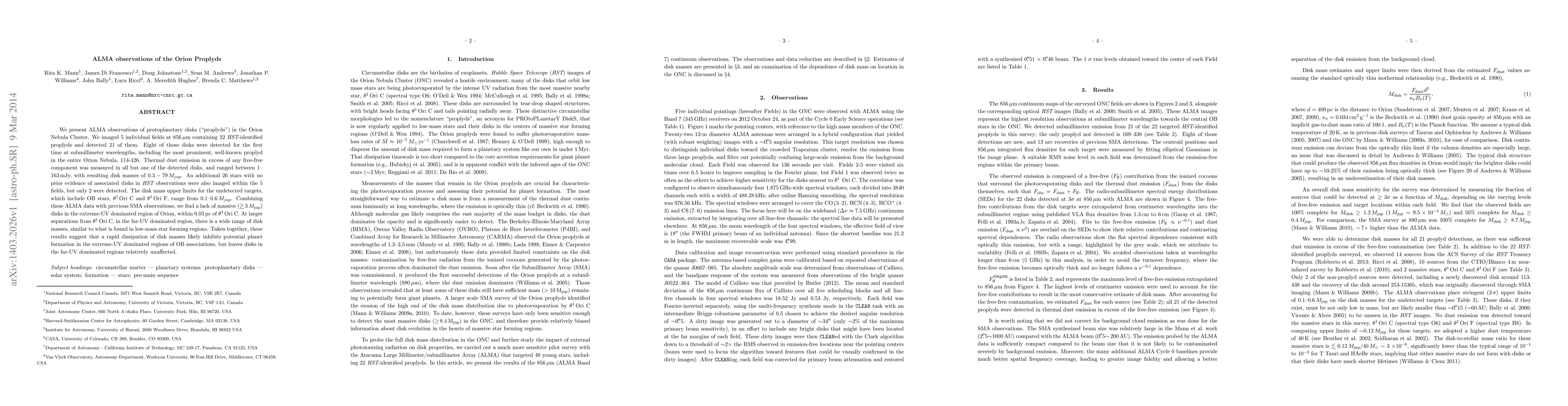 ALMA observations reveal protoplanetary disks ("proplyds") in the Orion Nebula Cluster, detecting 21 of 22 identified disks, including 8 for the first time at submillimeter wavelengths. The study suggests rapid dissipation of disk masses in extreme-UV regions near O-stars, inhibiting planet formation, while far-UV regions maintain a wide range of disk masses.