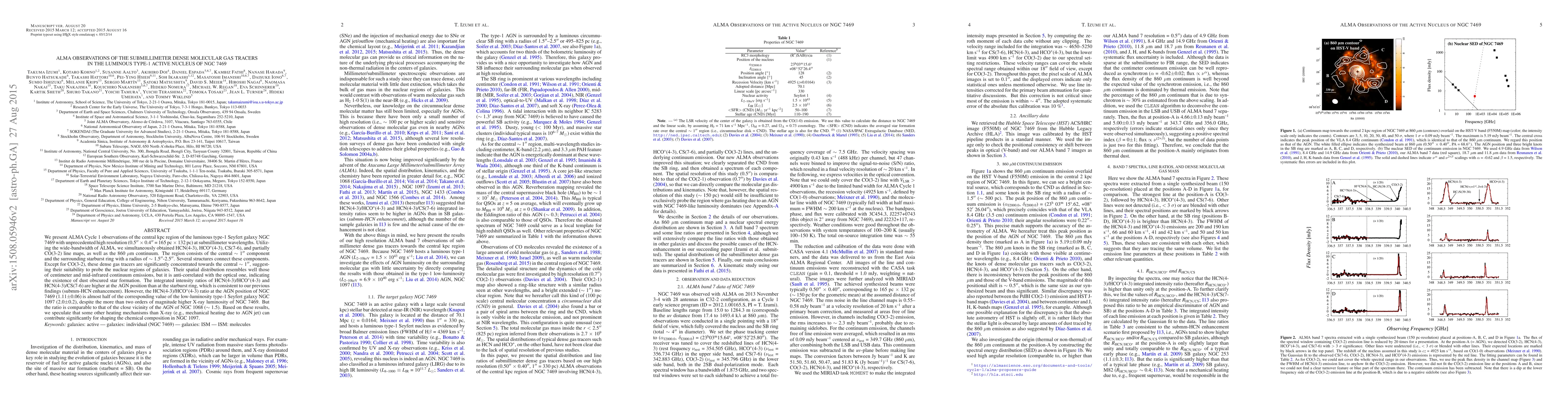 We present ALMA Cycle 1 observations of the central kpc region of the luminous type-1 Seyfert galaxy NGC 7469 with unprecedented high resolution (0.5$"$ $\times$ 0.4$"$ = 165 pc $\times$ 132 pc) at submillimeter wavelengths. Utilizing the wide-bandwidth of ALMA, we simultaneously obtained HCN(4-3), HCO$^+$(4-3), CS(7-6), and partially CO(3-2) line maps, as well as the 860 $\mu$m continuum. The region consists of the central $\sim$ 1$"$ component and the surrounding starburst ring with a radius of $\sim$ 1.5$"$-2.5$"$. Several structures connect these components. Except for CO(3-2), these dense gas tracers are significantly concentrated towards the central $\sim$ 1$"$, suggesting their suitability to probe the nuclear regions of galaxies. Their spatial distribution resembles well those of centimeter and mid-infrared continuum emissions, but it is anti-correlated with the optical one, indicating the existence of dust obscured star formation. The integrated intensity ratios of HCN(4-3)/HCO$^+$(4-3) and HCN(4-3)/CS(7-6) are higher at the AGN position than at the starburst ring, which is consistent to our previous findings (submm-HCN enhancement). However, the HCN(4-3)/HCO$^+$(4-3) ratio at the AGN position of NGC 7469 (1.11$\pm$0.06) is almost half of the corresponding value of the low-luminosity type-1 Seyfert galaxy NGC 1097 (2.0$\pm$0.2), despite the more than two orders of magnitude higher X-ray luminosity of NGC 7469. But the ratio is comparable to that of the close vicinity of the AGN of NGC 1068 ($\sim$ 1.5). Based on these results, we speculate that some other heating mechanisms than X-ray (e.g., mechanical heating due to AGN jet) can contribute significantly for shaping the chemical composition in NGC 1097.