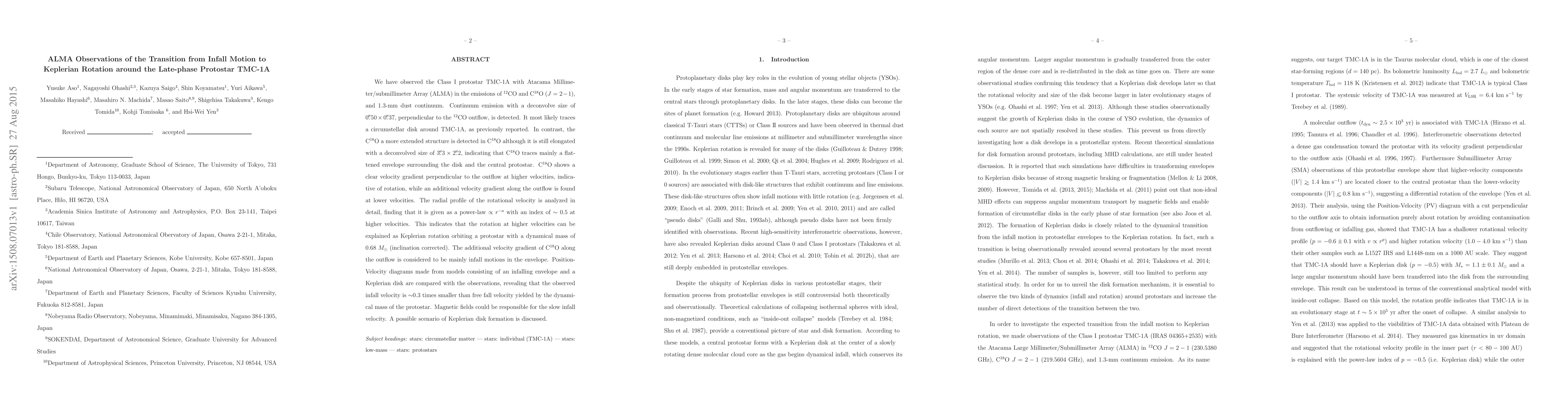 ALMA observations reveal the transition from infall motion to Keplerian rotation around the late-phase protostar TMC-1A, with a circumstellar disk and a flattened envelope. The C18O data indicate Keplerian rotation at higher velocities, suggesting a protostar with a mass of 0.68 Mo, while infall motions in the envelope are slower than free fall, possibly due to magnetic fields.