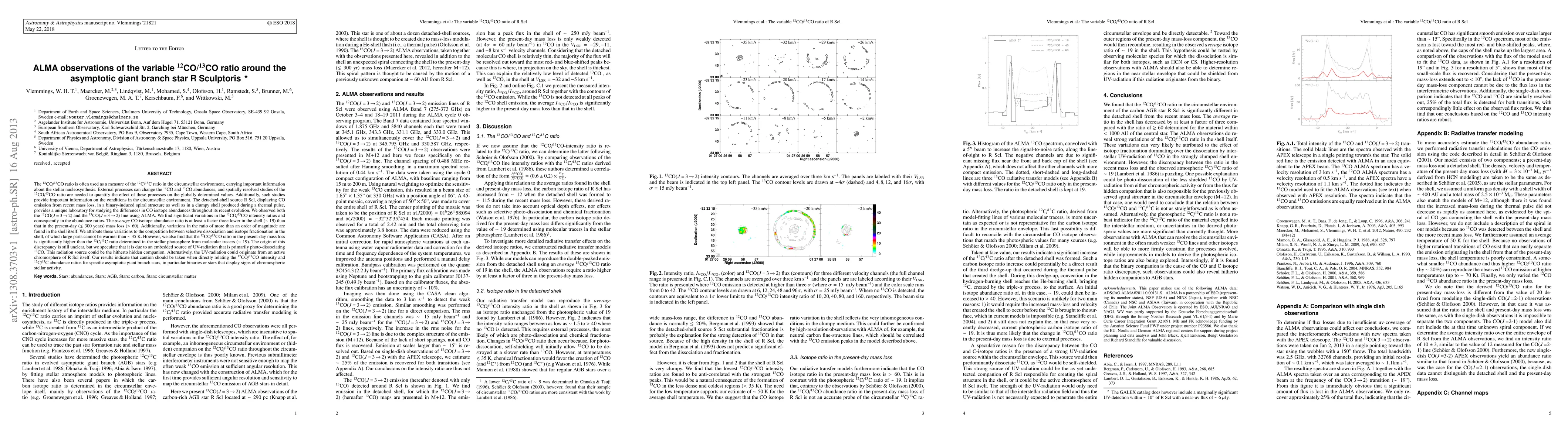 [abridged] The 12CO/13CO ratio is often used as a measure of the 12C/13C ratio in the circumstellar environment, carrying important information about the stellar nucleosynthesis. External processes can change the 12CO and 13CO abundances, and spatially resolved studies of the 12CO/13CO ratio are needed to quantify the effect of these processes on the globally determined values. Additionally, such studies provide important information on the conditions in the circumstellar environment. The detached-shell source R Scl, displaying CO emission from recent mass loss, in a binary-induced spiral structure as well as in a clumpy shell produced during a thermal pulse, provides a unique laboratory for studying the differences in CO isotope abundances throughout its recent evolution. We observed both the 12CO(J=3-2) and the 13CO(J=3-2) line using ALMA. We find significant variations in the 12CO/13CO intensity ratios and consequently in the abundance ratios. The average CO isotope abundance ratio is at least a factor three lower in the shell (~19) than that in the present-day (<300 years) mass loss (>60). Additionally, variations in the ratio of more than an order of magnitude are found in the shell itself. We attribute these variations to the competition between selective dissociation and isotope fractionation in the shell, of which large parts cannot be warmer than ~35 K. However, we also find that the 12CO/13CO ratio in the present-day mass loss is significantly higher than the 12C/13C ratio determined in the stellar photosphere from molecular tracers (~19). The origin of this discrepancy is still unclear, but we speculate that it is due to an embedded source of UV-radiation that is primarily photo-dissociating 13CO. This radiation source could be the hitherto hidden companion. Alternatively, the UV-radiation could originate from an active chromosphere of R Scl itself....