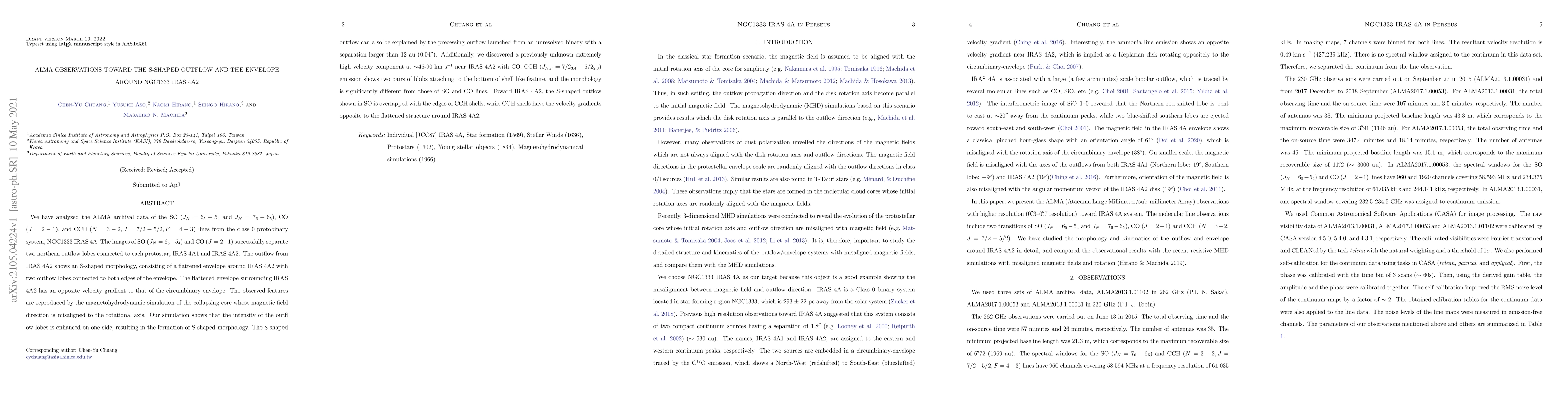 We have analyzed the ALMA archival data of the SO ($J_N=6_5-5_4$ and $J_N=7_6-6_5$), CO ($J=2-1$), and CCH ($N=3-2, J=7/2-5/2, F=4-3$) lines from the class 0 protobinary system, NGC1333 IRAS 4A. The images of SO ($J_N = 6_5-5_4$) and CO ($J=2-1$) successfully separate two northern outflow lobes connected to each protostar, IRAS 4A1 and IRAS 4A2. The outflow from IRAS 4A2 shows an S-shaped morphology, consisting of a flattened envelope around IRAS 4A2 with two outflow lobes connected to both edges of the envelope. The flattened envelope surrounding IRAS 4A2 has an opposite velocity gradient to that of the circumbinary envelope. The observed features are reproduced by the magnetohydrodynamic simulation of the collapsing core whose magnetic field direction is misaligned to the rotational axis. Our simulation shows that the intensity of the outflow lobes is enhanced on one side, resulting in the formation of S-shaped morphology. The S-shaped outflow can also be explained by the precessing outflow launched from an unresolved binary with a separation larger than 12 au (0.04arcsec). Additionally, we discovered a previously unknown extremely high velocity component at $\sim$45-90 km/s near IRAS 4A2 with CO. CCH ($J_{N,F}=7/2_{3,4}-5/2_{2,3}$) emission shows two pairs of blobs attaching to the bottom of shell like feature, and the morphology is significantly different from those of SO and CO lines. Toward IRAS 4A2, the S-shaped outflow shown in SO is overlapped with the edges of CCH shells, while CCH shells have the velocity gradients opposite to the flattened structure around IRAS 4A2.