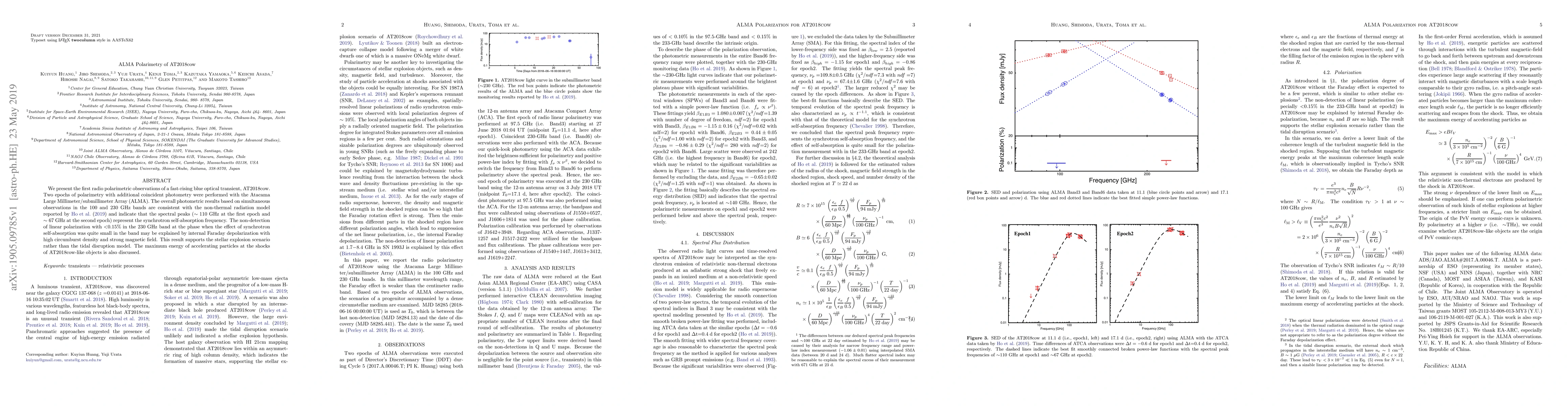 We present the first radio polarimetric observations of a fast-rising blue optical transient, AT2018cow. Two epochs of polarimetry with additional coincident photometry were performed with the Atacama Large Millimeter/submillimeter Array (ALMA). The overall photometric results based on simultaneous observations in the 100 and 230 GHz bands are consistent with the non-thermal radiation model reported by Ho et al. (2019) and indicate that the spectral peaks ($\sim110$ GHz at the first epoch and $\sim67$ GHz at the second epoch) represent the synchrotron self-absorption frequency. The non-detection of linear polarization with $<$0.15% in the 230 GHz band at the phase when the effect of synchrotron self-absorption was quite small in the band may be explained by internal Faraday depolarization with high circumburst density and strong magnetic field. This result supports the stellar explosion scenario rather than the tidal disruption model. The maximum energy of accelerating particles at the shocks of AT2018cow-like objects is also discussed.