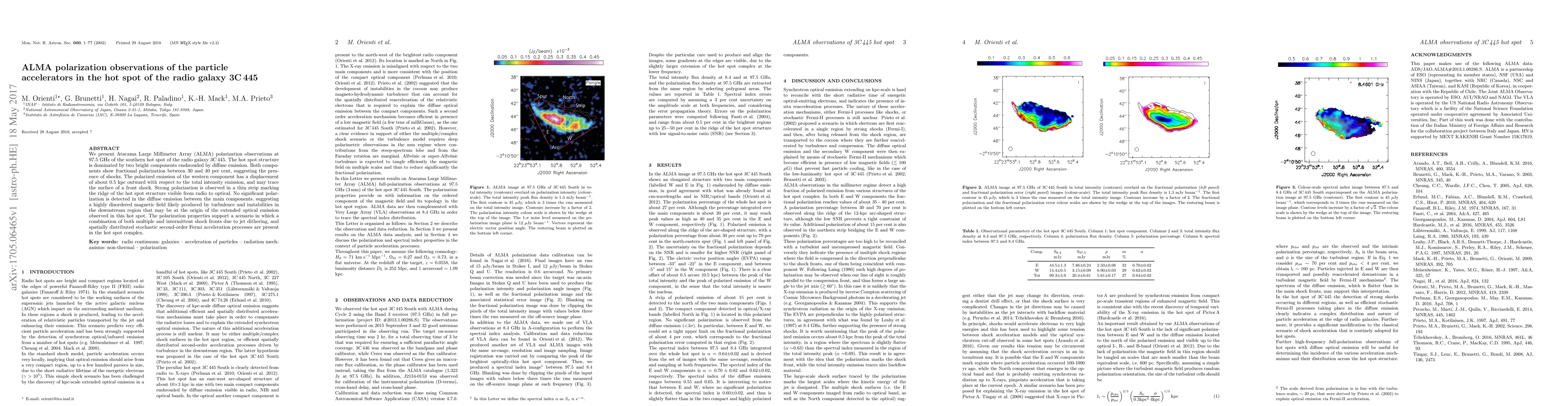 ALMA observations reveal polarized emission from two bright components in 3C 445's hot spot, suggesting shock fronts and turbulent magnetic fields. This supports a scenario with multiple and intermittent shock fronts and stochastic second-order Fermi acceleration processes.
