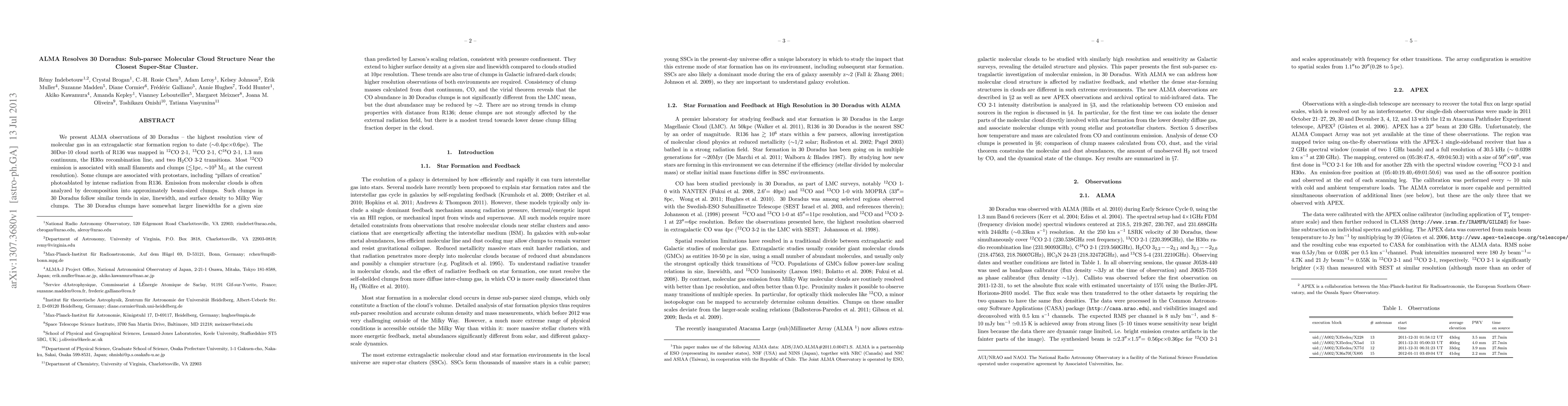 We present ALMA observations of 30 Doradus -- the highest resolution view of molecular gas in an extragalactic star formation region to date (~0.4pc x 0.6pc). The 30Dor-10 cloud north of R136 was mapped in 12CO 2-1, 13CO 2-1, C18O 2-1, 1.3mm continuum, the H30alpha recombination line, and two H2CO 3-2 transitions. Most 12CO emission is associated with small filaments and clumps (<1pc, ~1000 Msun at the current resolution). Some clumps are associated with protostars, including "pillars of creation" photoablated by intense radiation from R136. Emission from molecular clouds is often analyzed by decomposition into approximately beam-sized clumps. Such clumps in 30 Doradus follow similar trends in size, linewidth, and surface density to Milky Way clumps. The 30 Doradus clumps have somewhat larger linewidths for a given size than predicted by Larson's scaling relation, consistent with pressure confinement. They extend to higher surface density at a given size and linewidth compared to clouds studied at 10pc resolution. These trends are also true of clumps in Galactic infrared-dark clouds; higher resolution observations of both environments are required. Consistency of clump masses calculated from dust continuum, CO, and the virial theorem reveals that the CO abundance in 30 Doradus clumps is not significantly different from the LMC mean, but the dust abundance may be reduced by ~2. There are no strong trends in clump properties with distance from R136; dense clumps are not strongly affected by the external radiation field, but there is a modest trend towards lower dense clump filling fraction deeper in the cloud.