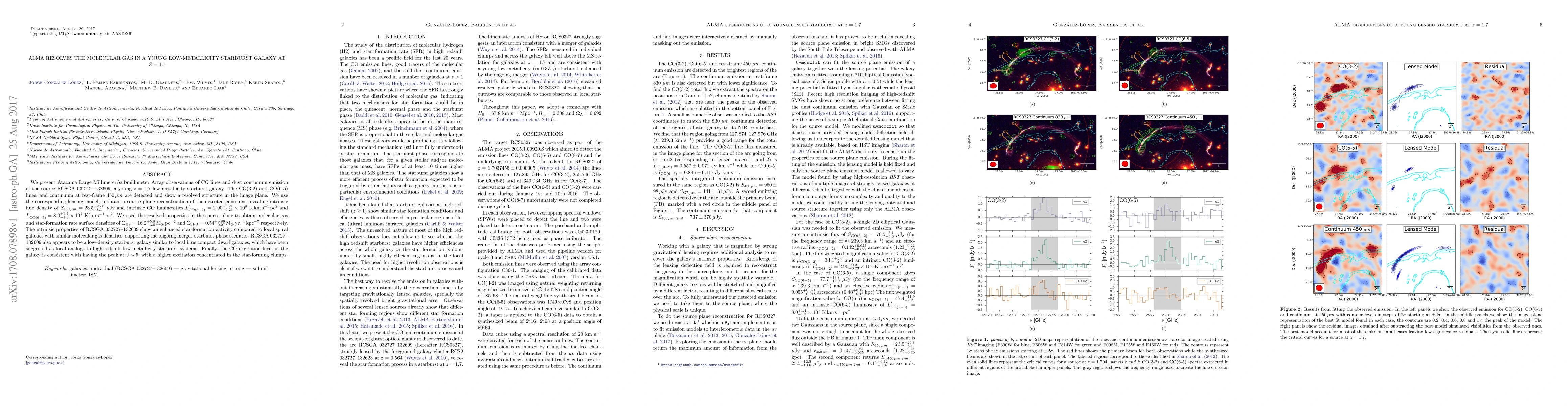 We present Atacama Large Millimeter/submillimeter Array observations of CO lines and dust continuum emission of the source RCSGA 032727--132609, a young $z=1.7$ low-metallicity starburst galaxy. The CO(3-2) and CO(6-5) lines, and continuum at rest-frame $450\,\mu m$ are detected and show a resolved structure in the image plane. We use the corresponding lensing model to obtain a source plane reconstruction of the detected emissions revealing intrinsic flux density of $S_{450\,\mu m}=23.5_{-8.1}^{+26.8}$ $\mu$Jy and intrinsic CO luminosities $L'_{\rm CO(3-2)}=2.90_{-0.23}^{+0.21}\times10^{8}$ ${\rm K\,km\,s^{-1}\,pc^{2}}$ and $L'_{\rm CO(6-5)}=8.0_{-1.3}^{+1.4}\times10^{7}$ ${\rm K\,km\,s^{-1}\,pc^{2}}$. We used the resolved properties in the source plane to obtain molecular gas and star-formation rate surface densities of $\Sigma_{\rm H2}=16.2_{-3.5}^{+5.8}\,{\rm M}_{\odot}\,{\rm pc}^{-2}$ and $\Sigma_{\rm SFR}=0.54_{-0.27}^{+0.89}\,{\rm M}_{\odot}\,{\rm yr}^{-1}\,{\rm kpc}^{-2}$ respectively. The intrinsic properties of RCSGA 032727--132609 show an enhanced star-formation activity compared to local spiral galaxies with similar molecular gas densities, supporting the ongoing merger-starburst phase scenario. RCSGA 032727--132609 also appears to be a low--density starburst galaxy similar to local blue compact dwarf galaxies, which have been suggested as local analogs to high-redshift low-metallicity starburst systems. Finally, the CO excitation level in the galaxy is consistent with having the peak at ${\rm J}\sim5$, with a higher excitation concentrated in the star-forming clumps.