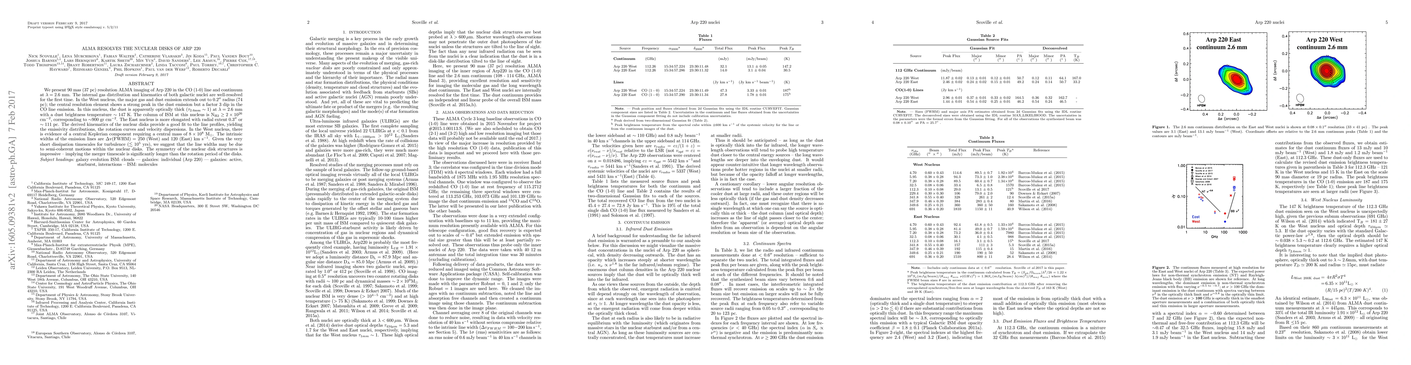We present 90 mas (37 pc) resolution ALMA imaging of Arp 220 in the CO (1-0) line and continuum at $\lambda = 2.6$ mm. The internal gas distribution and kinematics of both galactic nuclei are well-resolved for the first time. In the West nucleus, the major gas and dust emission extends out to 0.2\arcsec radius (74 pc); the central resolution element shows a strong peak in the dust emission but a factor 3 dip in the CO line emission. In this nucleus, the dust is apparently optically thick ($\tau_{\rm 2.6mm} \sim1$) at $\lambda = 2.6$ mm with a dust brightness temperature $\sim147$ K. The column of ISM at this nucleus is $\rm N_{H2} \geq 2\times10^{26}$ cm$^{-2}$, corresponding to $\sim$900 gr cm$^{-2}$. The East nucleus is more elongated with radial extent 0.3\arcsec or $\sim111$ pc. The derived kinematics of the nuclear disks provide a good fit to the line profiles, yielding the emissivity distributions, the rotation curves and velocity dispersions. In the West nucleus, there is evidence of a central Keplerian component requiring a central mass of $8\times10^8$ \msun. The intrinsic widths of the emission lines are $\Delta \rm v (FWHM)$ = 250 (West) and 120 (East) \kms. Given the very short dissipation timescales for turbulence ($\lesssim10^5$ yrs), we suggest that the line widths may be due to semi-coherent motions within the nuclear disks. The symmetry of the nuclear disk structures is impressive -- implying the merger timescale is significantly longer than the rotation period of the disks.