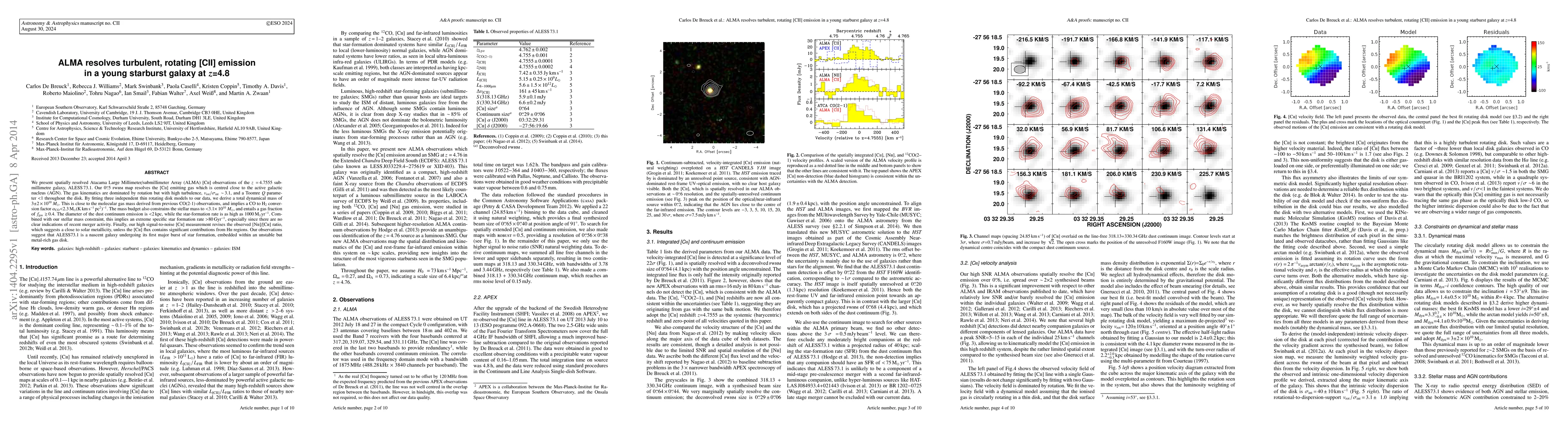 ALMA observations reveal turbulent, rotating [CII] emission in the young starburst galaxy ALESS 73.1 at z=4.8, indicating a high star-formation rate and a metal-rich, unstable gas disk. The galaxy's gas dynamics suggest a total dynamical mass of 3+-2x10^10 M_sol, with an extreme specific star formation rate.