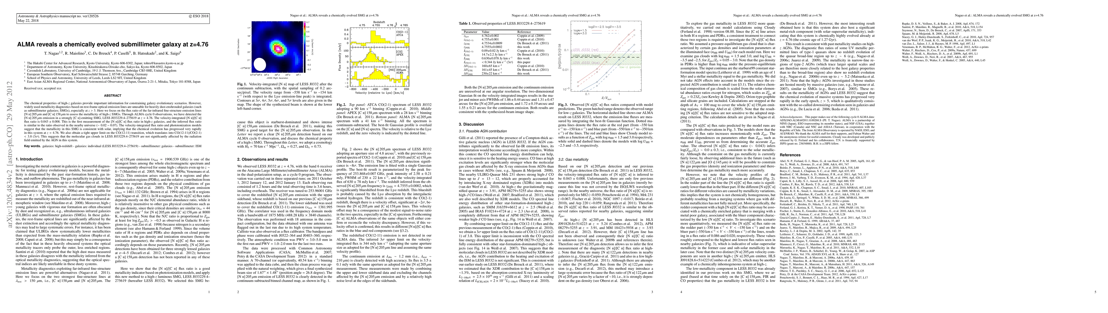 ALMA observations detect the [NII]205um emission in a submillimeter galaxy at z=4.76, revealing a metallicity consistent with solar, indicating rapid chemical evolution. The study also sets a tight upper limit on the CO(12-11) transition, suggesting minimal AGN influence on the molecular gas.