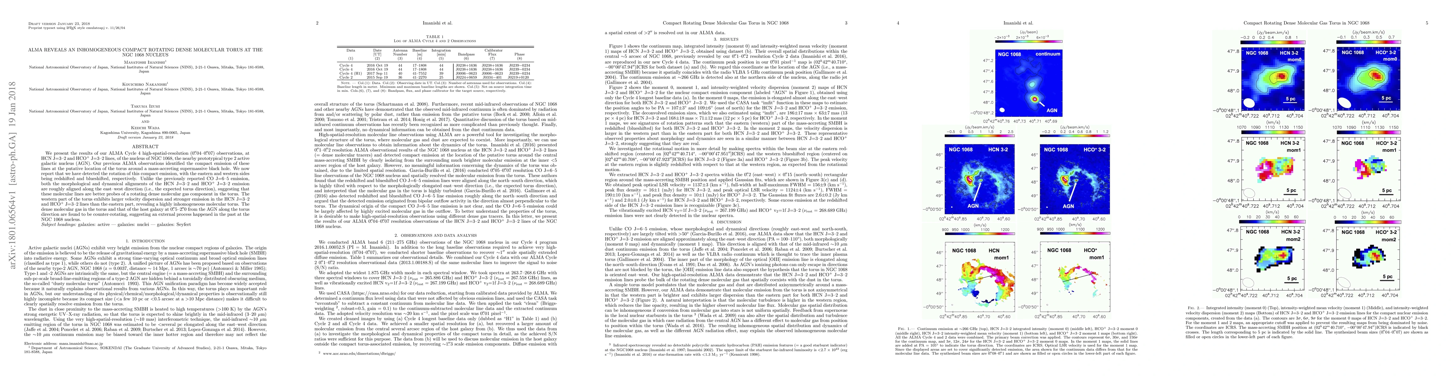 ALMA observations reveal an inhomogeneous, compact rotating dense molecular torus around NGC 1068's supermassive black hole, with the western side showing higher velocity dispersion and stronger emission. The torus's dense molecular gas is counter-rotating relative to the host galaxy's gas, indicating past external processes.