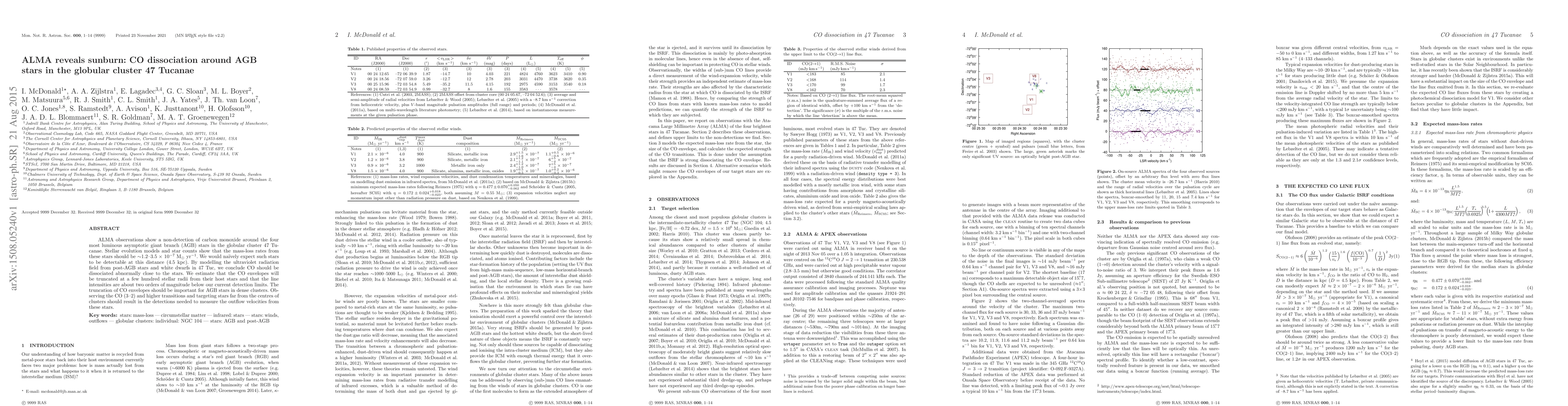 ALMA observations show a non-detection of carbon monoxide around the four most luminous asymptotic giant branch (AGB) stars in the globular cluster 47 Tucanae. Stellar evolution models and star counts show that the mass-loss rates from these stars should be ~1.2-3.5 x 10^-7 solar masses per year. We would naively expect such stars to be detectable at this distance (4.5 kpc). By modelling the ultraviolet radiation field from post-AGB stars and white dwarfs in 47 Tuc, we conclude CO should be dissociated abnormally close to the stars. We estimate that the CO envelopes will be truncated at a few hundred stellar radii from their host stars and that the line intensities are about two orders of magnitude below our current detection limits. The truncation of CO envelopes should be important for AGB stars in dense clusters. Observing the CO (3-2) and higher transitions and targeting stars far from the centres of clusters should result in the detections needed to measure the outflow velocities from these stars.