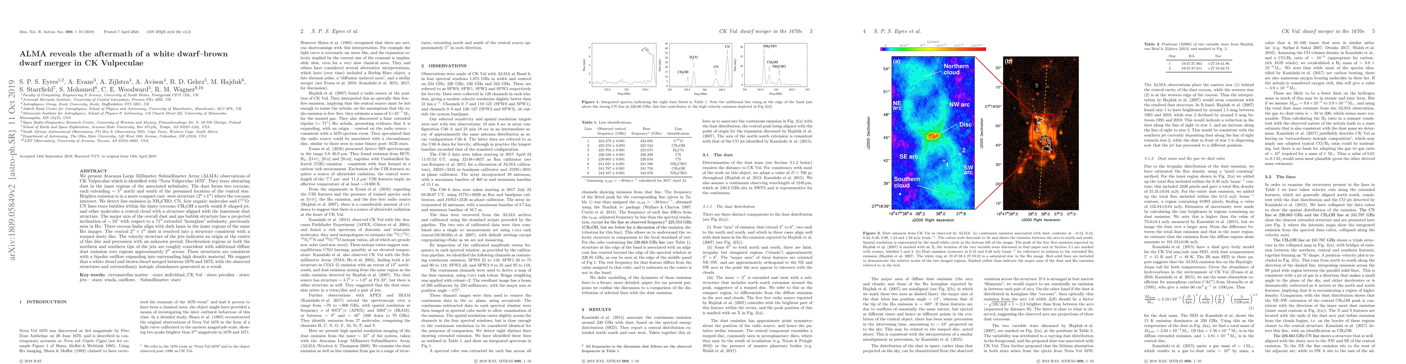 ALMA observations of CK Vulpeculae reveal the aftermath of a white dwarf--brown dwarf merger, showing two dusty cocoons intersecting in a compact emission region. The data suggest a bipolar outflow and extraordinary isotopic abundances, consistent with the merger occurring between 1670 and 1672.