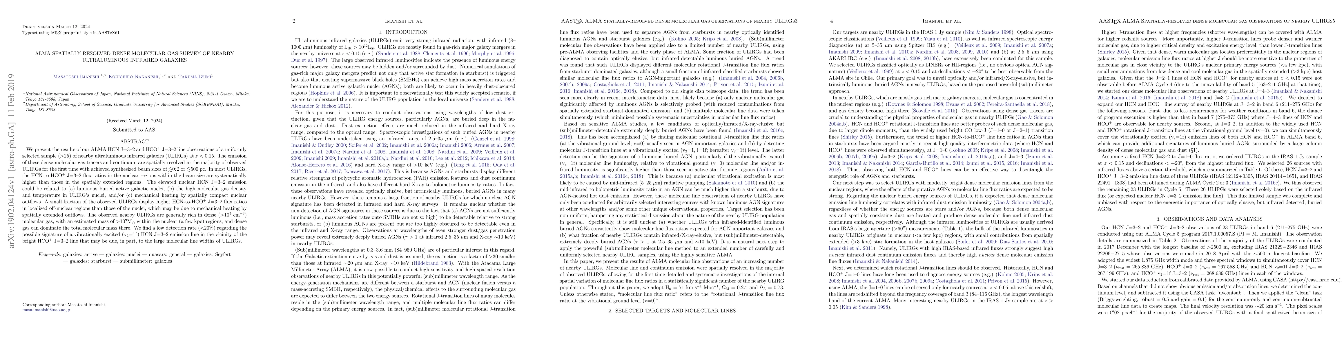 This paper reports ALMA observations of dense molecular gas in nearby ultraluminous infrared galaxies (ULIRGs), revealing higher HCN-to-HCO+ flux ratios in nuclear regions, likely due to active galactic nuclei, high gas density, and compact outflows. Most ULIRGs contain dense gas masses exceeding 10^9 Msun within their nuclei.