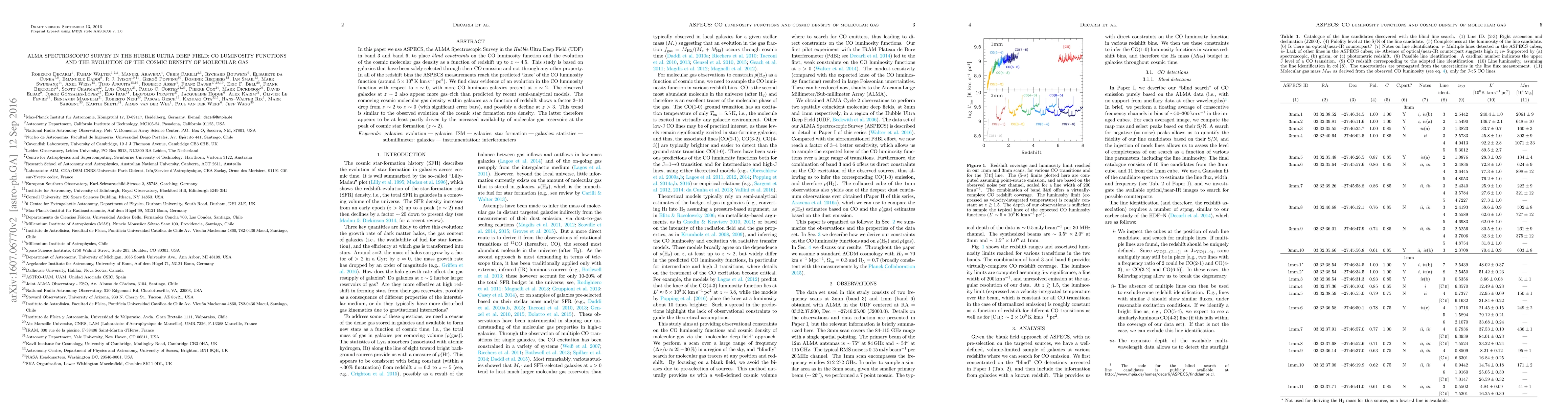 This paper utilizes ALMA's ASPECS survey in the Hubble Ultra Deep Field to analyze CO luminosity functions and the cosmic density of molecular gas up to $z\sim 4.5$. It finds an evolution in the CO luminosity function with more gas-rich galaxies at $z\sim 2$, indicating a significant drop in cosmic molecular gas density from $z\sim 2$ to $z\sim 0$, correlating with the decline in cosmic star formation rate density.