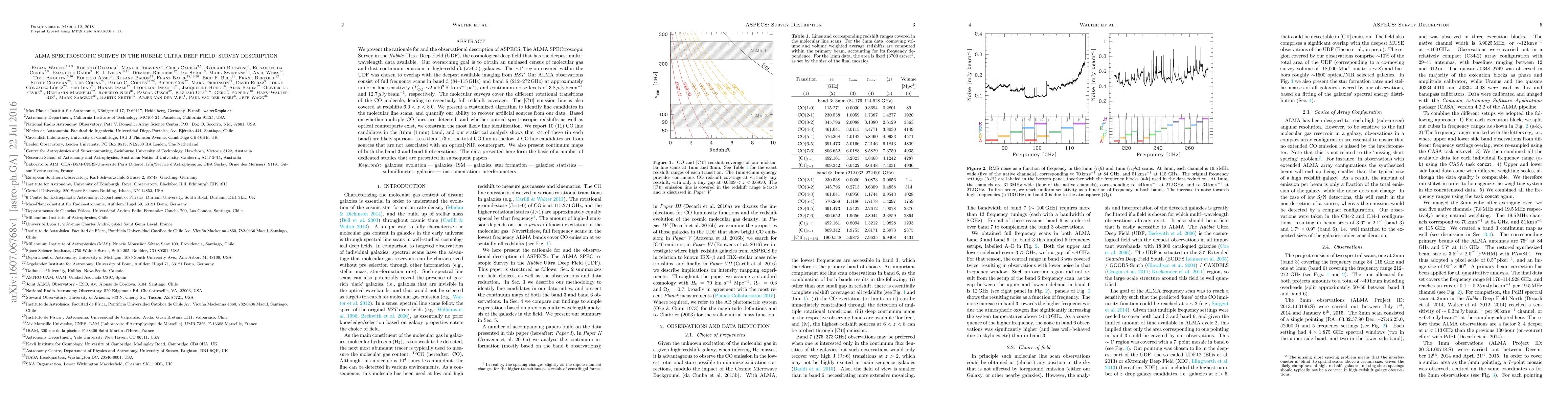 The ASPECS survey using ALMA in the Hubble Ultra Deep Field aims to conduct an unbiased census of molecular gas and dust in high-redshift galaxies, identifying CO line candidates and [CII] emission lines. The survey reports 10 CO line candidates, with less than 4 likely spurious, and provides continuum maps for both band 3 and band 6 observations.