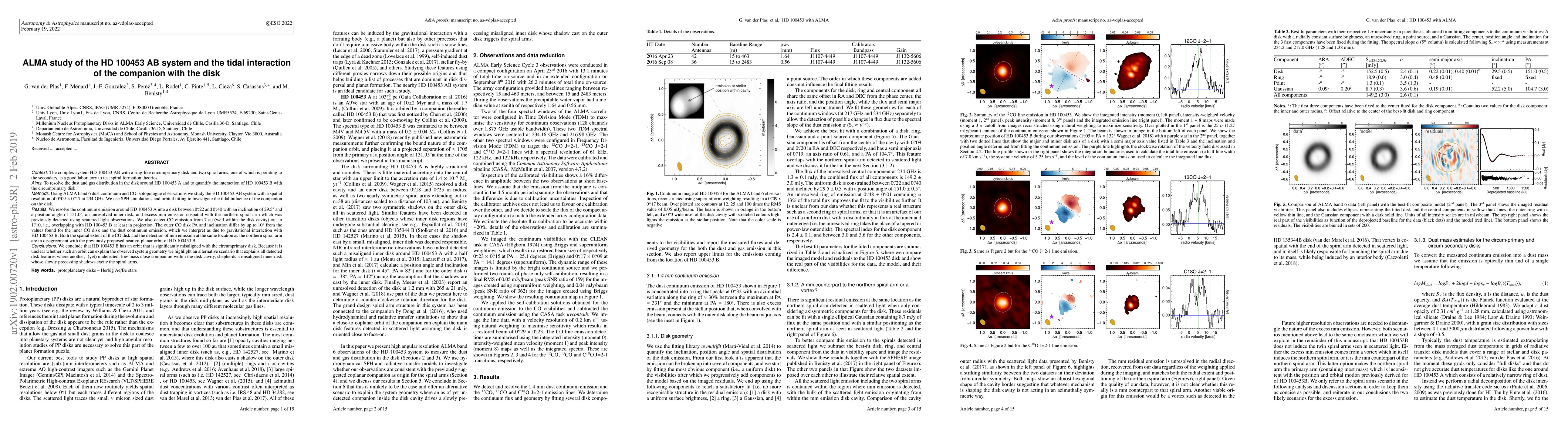 Context: The complex system HD 100453 AB with a ring-like circumprimary disk and two spiral arms, one of which is pointing to the secondary, is a good laboratory to test spiral formation theories. Aims: To quantify the interaction of HD 100453 B with the circumprimary disk. Methods: Using ALMA band 6 dust continuum and CO isotopologue observations we study the HD 100453 AB system with a spatial resolution of 0.09" x 0.17" at 234 GHz. We use SPH simulations and orbital fitting to investigate the tidal influence of the companion on the disk. Results: We resolve the continuum emission around HD 100453 A into a disk between 0.22" and 0.40" with an inclination of 29.5 deg. and a position angle of 151.0 deg., an unresolved inner disk, and excess mm emission cospatial with the northern spiral arm which was previously detected using scattered light observations. We also detect CO emission from 7 au (well within the disk cavity) out to 1.10", i.e., overlapping with HD 100453 B at least in projection. The outer CO disk PA and inclination differ by up to 10 deg. from the values found for the inner CO disk and the dust continuum emission, which we interpret as due to gravitational interaction with HD 100453 B. Both the spatial extent of the CO disk and the detection of mm emission at the same location as the northern spiral arm are in disagreement with the previously proposed near co-planar orbit of HD 100453 B. Conclusions: We conclude that HD 100453 B has an orbit that is significantly misaligned with the circumprimary disk. Because it is unclear whether such an orbit can explain the observed system geometry we highlight an alternative scenario that explains all detected disk features where another, (yet) undetected, low mass close companion within the disk cavity, shepherds a misaligned inner disk whose slowly precessing shadows excite the spiral arms.
