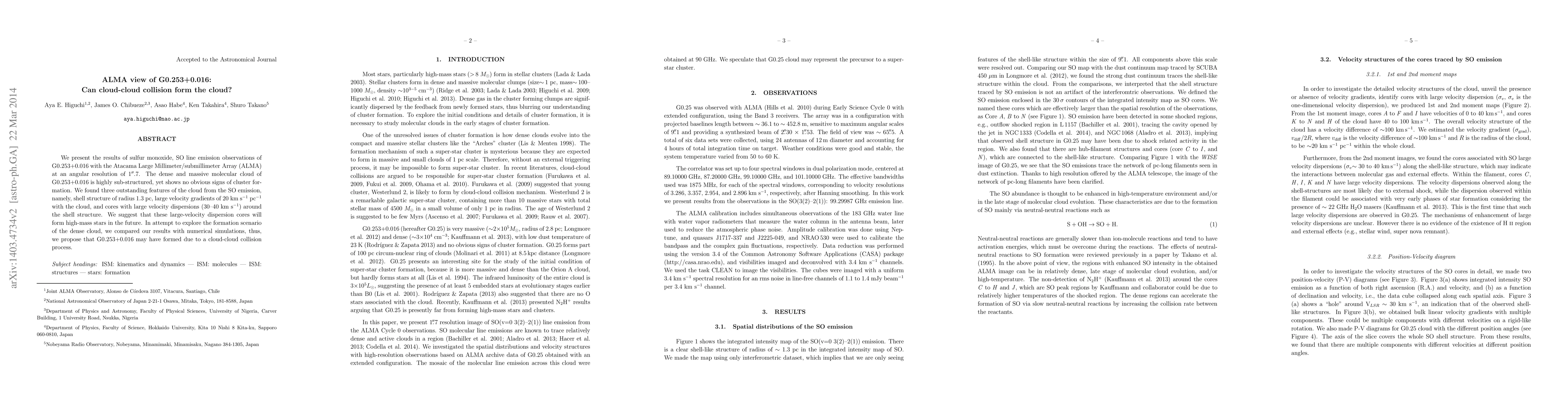We present the results of sulfur monoxide, SO line emission observations of G0.253+0.016 with the Atacama Large Millimeter/submillimeter Array (ALMA) at an angular resolution of 1.7 arcsec. The dense and massive molecular cloud of G0.253+0.016 is highly sub-structured, yet shows no obvious signs of cluster formation. We found three outstanding features of the cloud from the SO emission, namely, shell structure of radius 1.3 pc, large velocity gradients of 20 km/s/pc with the cloud, and cores with large velocity dispersions (30-40 km/s) around the shell structure. We suggest that these large-velocity dispersion cores will form high-mass stars in the future. In attempt to explore the formation scenario of the dense cloud, we compared our results with numerical simulations, thus, we propose that G0.253+0.016 may have formed due to a cloud-cloud collision process.