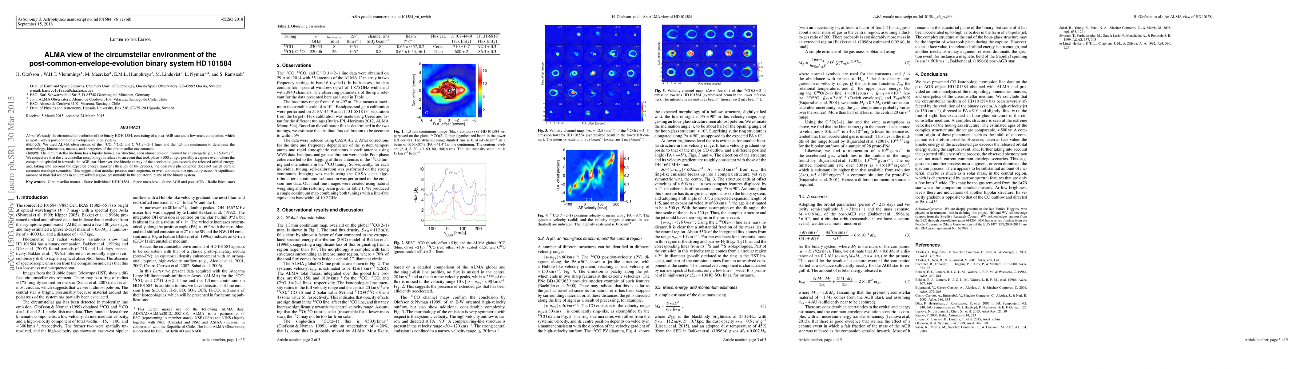 We study the circumstellar evolution of the binary HD101584, consisting of a post-AGB star and a low-mass companion, which is most likely a post-common-envelope-evolution system. We used ALMA observations of the 12CO, 13CO, and C18O J=2-1 lines and the 1.3mm continuum to determine the morphology, kinematics, masses, and energetics of the circumstellar environment. The circumstellar medium has a bipolar hour-glass structure, seen almost pole-on, formed by an energetic jet, about 150 km/s. We conjecture that the circumstellar morphology is related to an event that took place about 500 year ago, possibly a capture event where the companion spiraled in towards the AGB star. However, the kinetic energy of the accelerated gas exceeds the released orbital energy, and, taking into account the expected energy transfer efficiency of the process, the observed phenomenon does not match current common-envelope scenarios. This suggests that another process must augment, or even dominate, the ejection process. A significant amount of material resides in an unresolved region, presumably in the equatorial plane of the binary system.