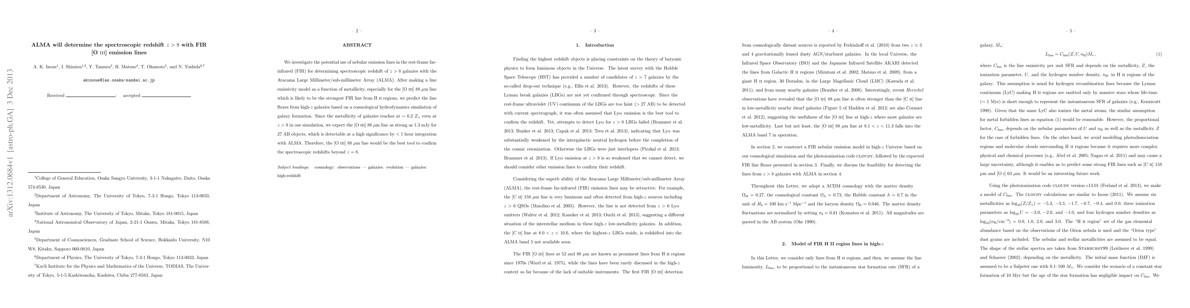 This paper investigates the use of [O III] 88 micron emission lines in the far-infrared to determine spectroscopic redshifts for galaxies at z>8 using ALMA. The study predicts strong [O III] line fluxes detectable by ALMA, suggesting it as a reliable tool for confirming redshifts beyond z=8.