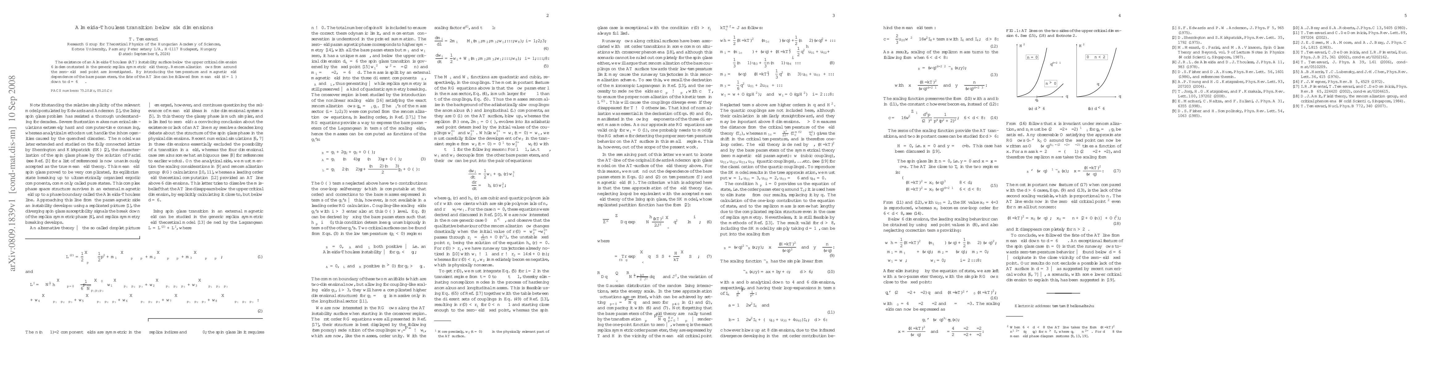 The existence of an Almeida-Thouless (AT) instability surface below the upper critical dimension 6 is demonstrated in the generic replica symmetric field theory. Renormalization flows from around the zero-field fixed point are investigated. By introducing the temperature and magnetic field dependence of the bare parameters, the fate of the AT line can be followed from mean field (infinite dimensions) down to d<6.