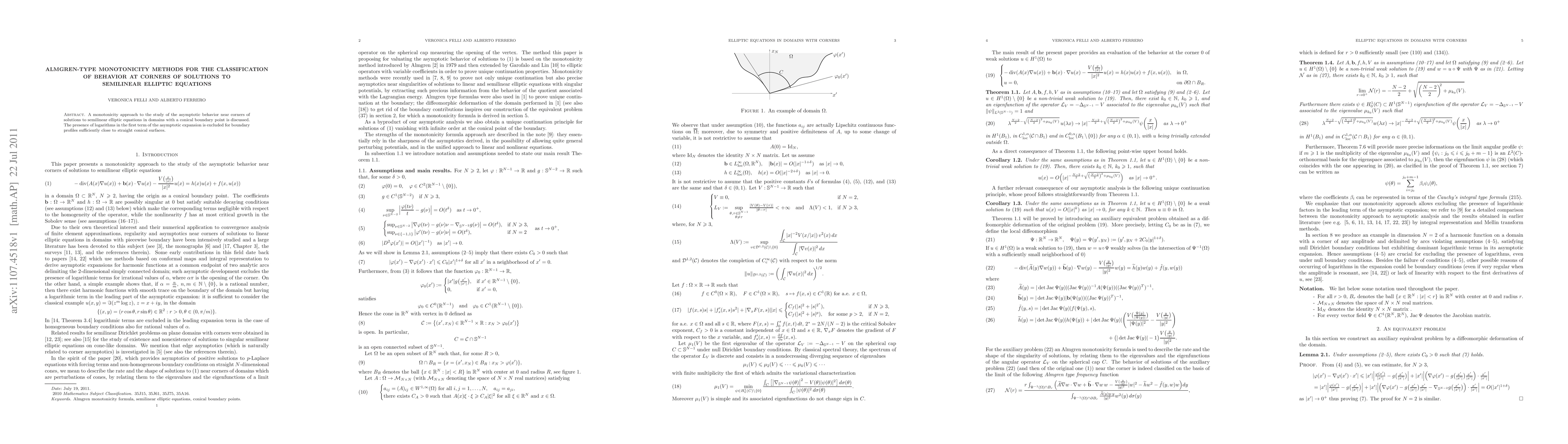 Summary: This paper employs Almgren-type monotonicity methods to classify the behavior of solutions to semilinear elliptic equations near corners, demonstrating that for boundary profiles close to conical surfaces, the asymptotic expansion does not include logarithmic terms.
