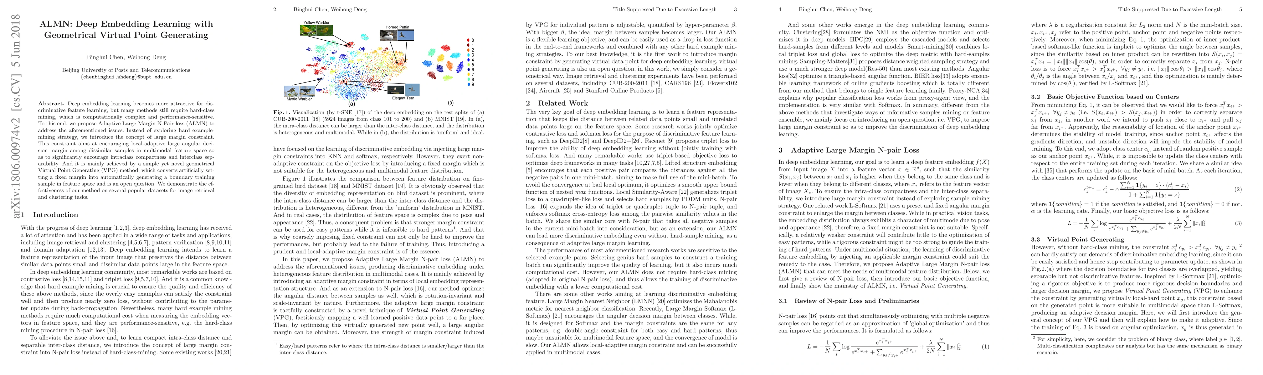 The paper proposes ALMN, a deep embedding learning method that uses geometrical Virtual Point Generating to improve feature space separation without relying on hard-class mining. It demonstrates effectiveness on image retrieval and clustering tasks with improved performance.