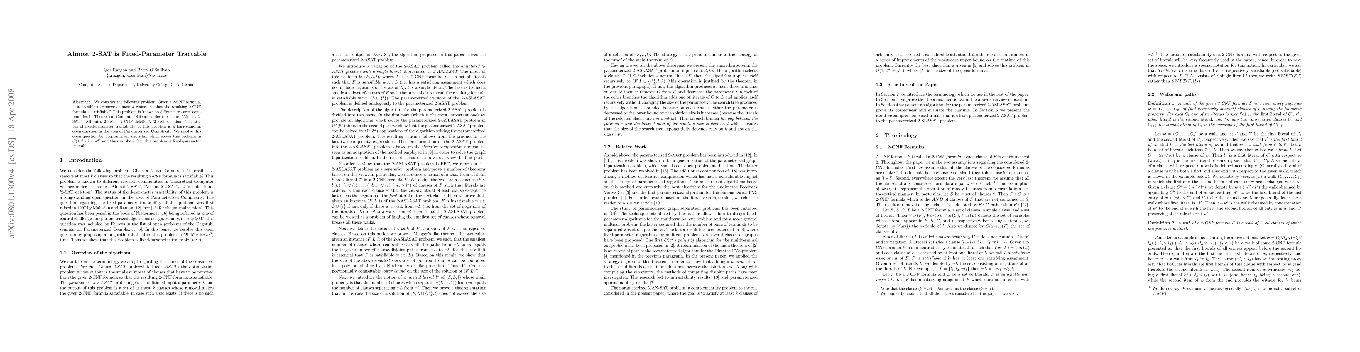 This paper resolves the longstanding open question of the fixed-parameter tractability of the Almost 2-SAT problem by presenting an algorithm that solves it in $O(15^k*k*m^3)$ time, demonstrating that the problem is indeed fixed-parameter tractable.