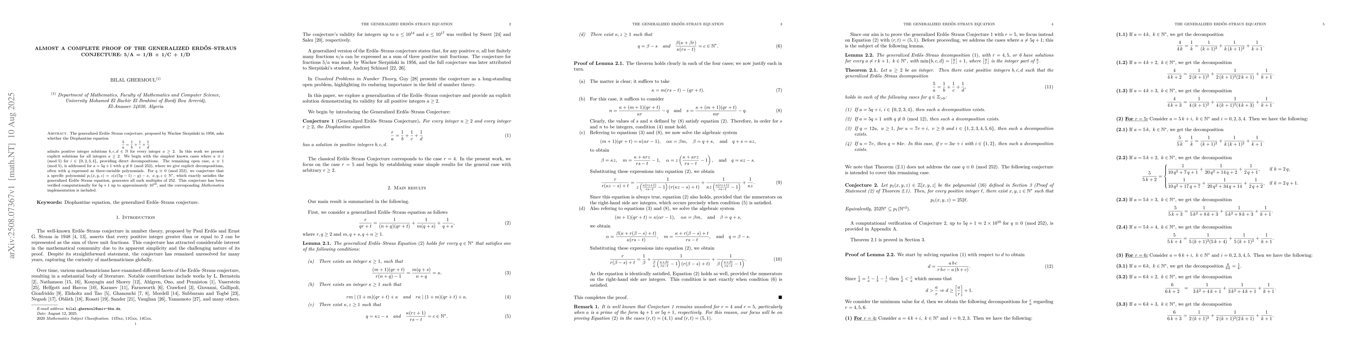 The generalized Erd\H{o}s-Straus conjecture, proposed by Wac\l{}aw Sierpi\'{n}ski in 1956, asks whether the Diophantine equation \[ \frac{5}{a} = \frac{1}{b} + \frac{1}{c} + \frac{1}{d} \] admits positive integer solutions $b,c,d \in \mathbb{N}$ for every integer $a \ge 2$. In this work we present explicit solutions for all integers $a \ge 2$. We begin with the simplest known cases where $a \equiv i \pmod{5}$ for $i \in \{0,2,3,4\}$, providing direct decompositions. The remaining open case, $a \equiv 1 \pmod{5}$, is addressed for $a = 5q + 1$ with $q \not\equiv 0 \pmod{252}$, where we give explicit decompositions, often with $q$ expressed as three-variable polynomials. For $q \equiv 0 \pmod{252}$, we conjecture that a specific polynomial $p_{1}(x,y,z)=z (x (5 y-1)-y)-x,~ x,y,z \in \mathbb{N}^*$, which exactly satisfies the generalized Erd\H{o}s--Straus equation, generates all such multiples of $252$. This conjecture has been verified computationally for $5q+1$ up to approximately $10^{10}$, and the corresponding \textit{Mathematica} implementation is included.