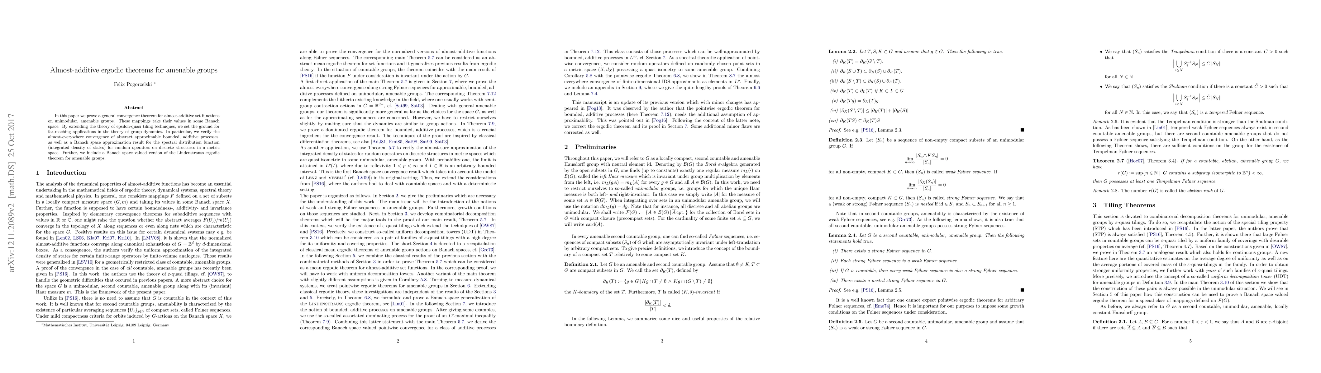 This paper establishes a general convergence theorem for almost-additive set functions on unimodular, amenable groups, extending epsilon-quasi tiling techniques. It also verifies the almost-everywhere convergence of abstract approximable bounded, additive processes and provides a Banach space valued version of the Lindenstrauss ergodic theorem.