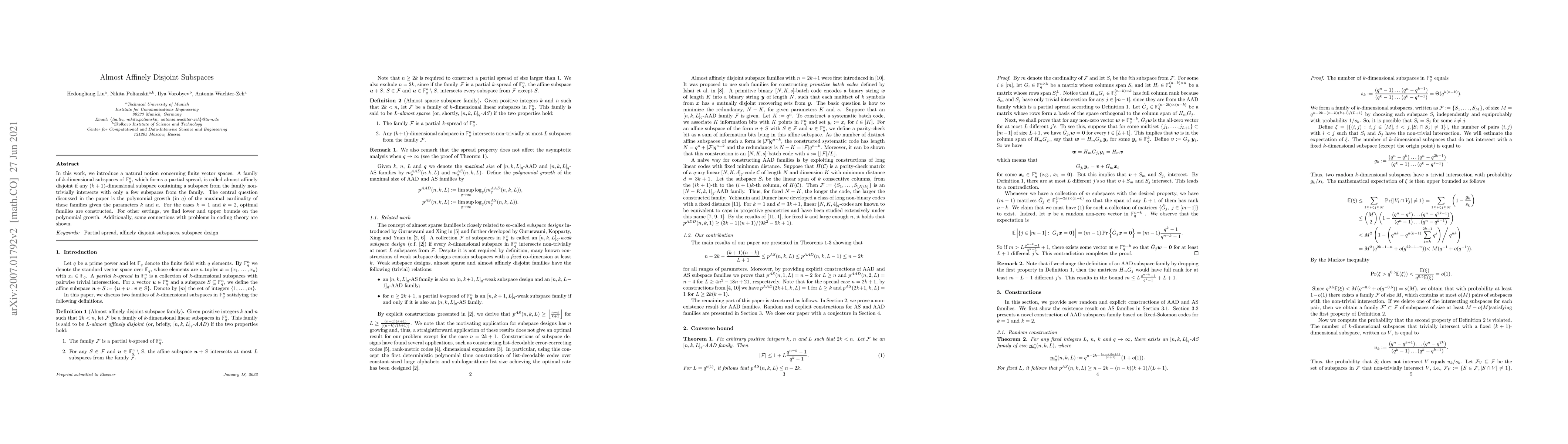 This paper introduces the concept of 'almost affinely disjoint subspaces' in finite vector spaces, focusing on their maximal cardinality for given dimensions k and n. Optimal families are constructed for k=1 and k=2, while lower and upper bounds are established for other cases. The research also links these findings to coding theory problems.