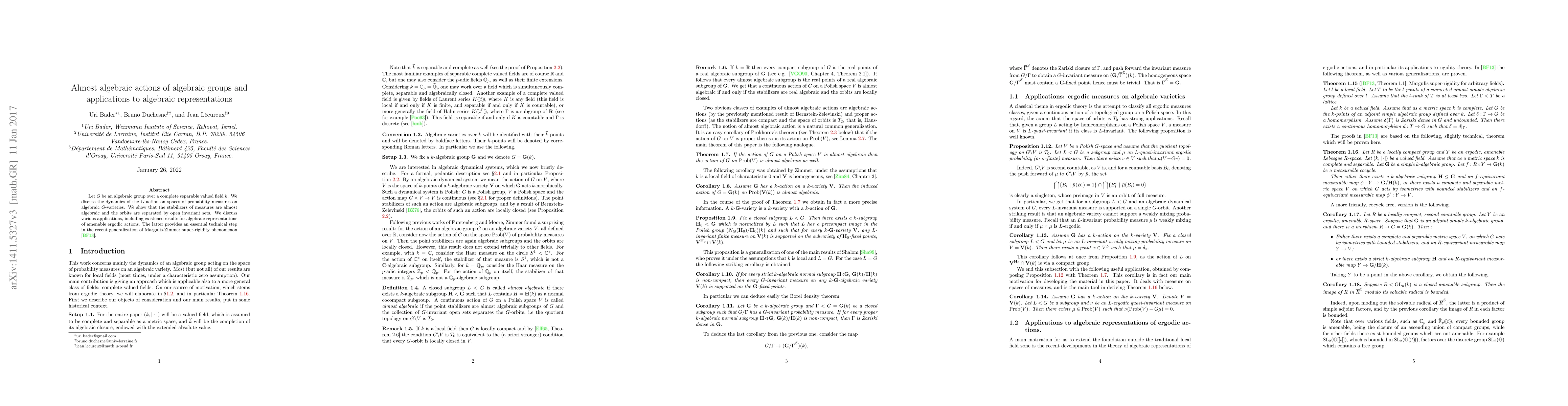 This paper explores the dynamics of algebraic group actions on probability measures on algebraic varieties, proving that stabilizers are almost algebraic and orbits are separated by invariant sets. It also applies these results to establish existence for algebraic representations of amenable ergodic actions, contributing to the generalization of Margulis-Zimmer super-rigidity.