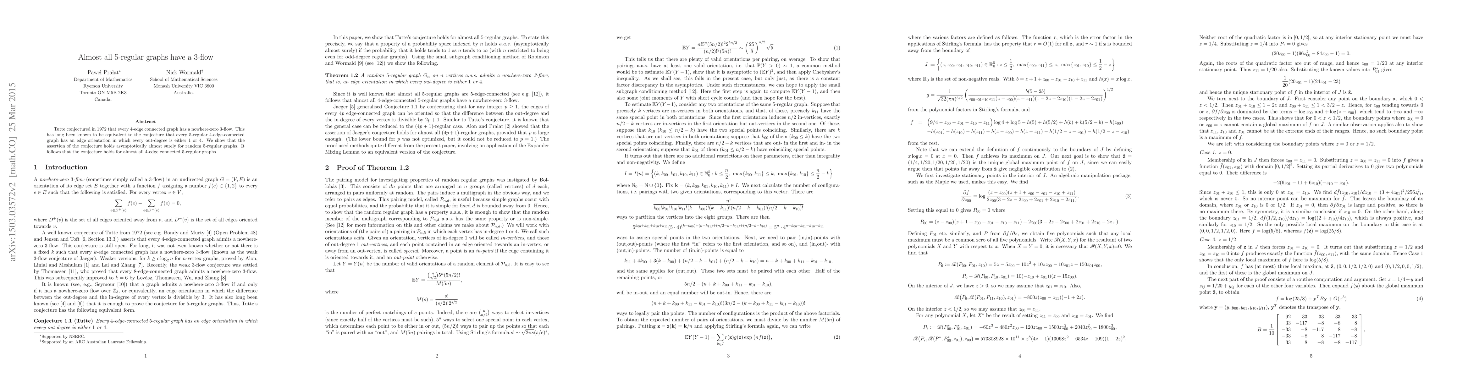 Tutte conjectured in 1972 that every 4-edge connected graph has a nowhere-zero 3-flow. This has long been known to be equivalent to the conjecture that every 5-regular 4-edge-connected graph has an edge orientation in which every out-degree is either 1 or 4. We show that the assertion of the conjecture holds asymptotically almost surely for random 5-regular graphs. It follows that the conjecture holds for almost all 4-edge connected 5-regular graphs.