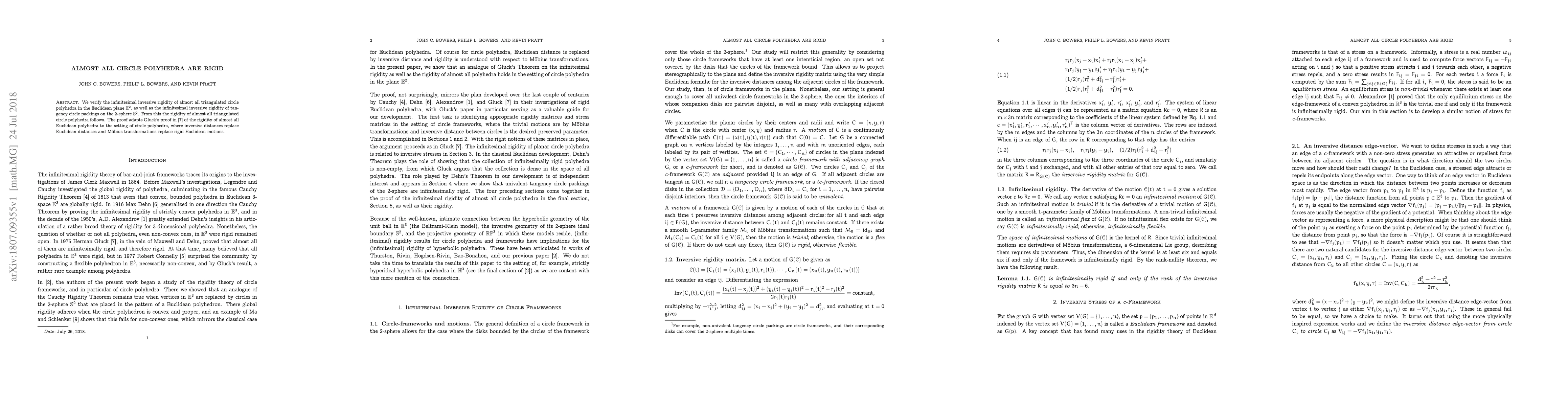 We verify the infinitesimal inversive rigidity of almost all triangulated circle polyhedra in the Euclidean plane $\mathbb{E}^{2}$, as well as the infinitesimal inversive rigidity of tangency circle packings on the $2$-sphere $\mathbb{S}^{2}$. From this the rigidity of almost all triangulated circle polyhedra follows. The proof adapts Gluck's proof in~\cite{gluck75} of the rigidity of almost all Euclidean polyhedra to the setting of circle polyhedra, where inversive distances replace Euclidean distances and M\"obius transformations replace rigid Euclidean motions.