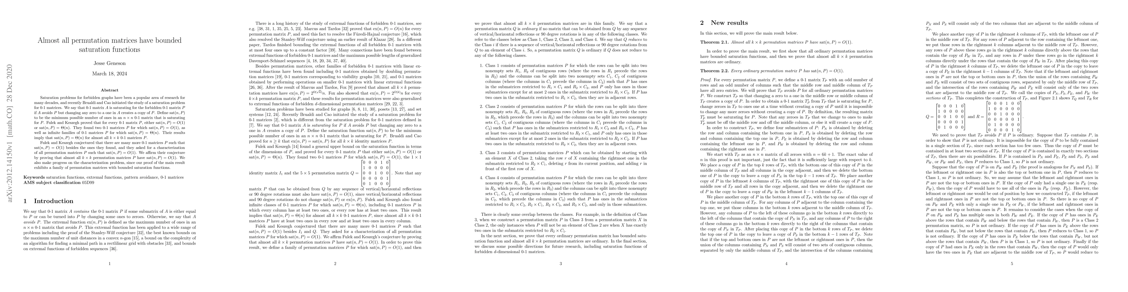 This paper proves that almost all permutation matrices have bounded saturation functions, affirming a conjecture by Fulek and Keszegh. It also advances the characterization of permutation matrices with bounded saturation functions by identifying a specific family of such matrices.
