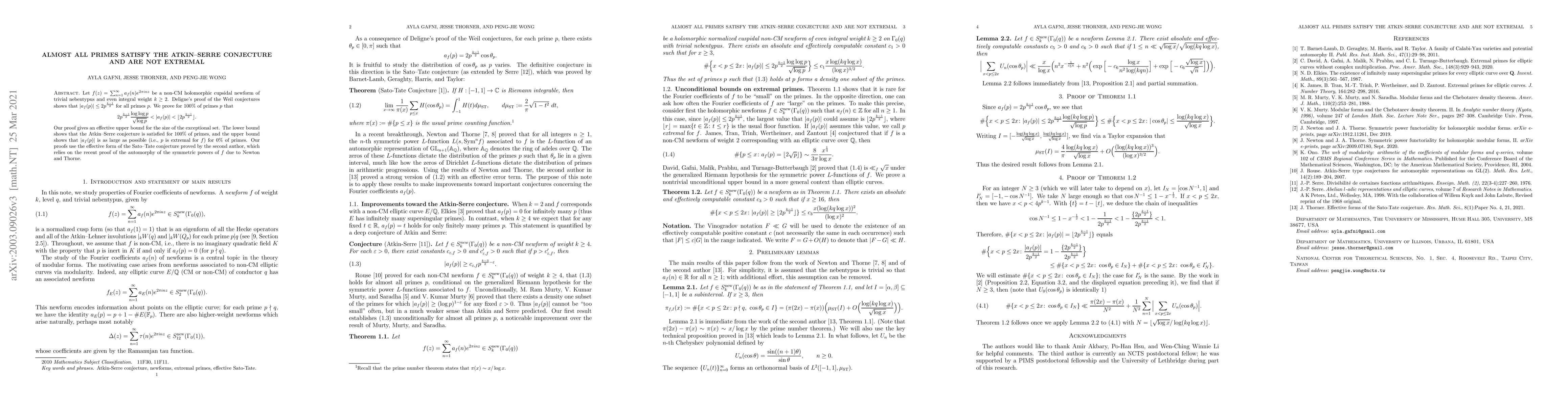This paper demonstrates that the Atkin-Serre conjecture holds for almost all primes, establishing a strict lower bound for the coefficients $|a_f(p)|$ of a holomorphic cuspidal newform $f(z)$, while showing that these primes are not extremal. The findings rely on the effective Sato-Tate conjecture and recent automorphy results.