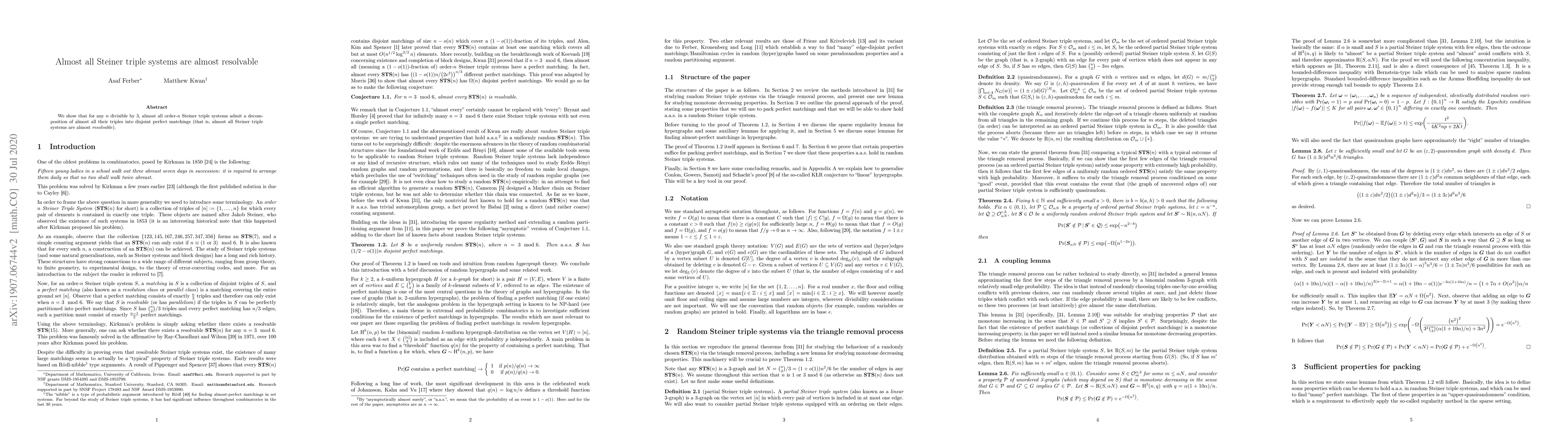 The paper introduces and applies advanced combinatorial lemmas and a hypergraph version of the Kővári–Rödl conjecture to prove almost resolvability of Steiner triple systems.