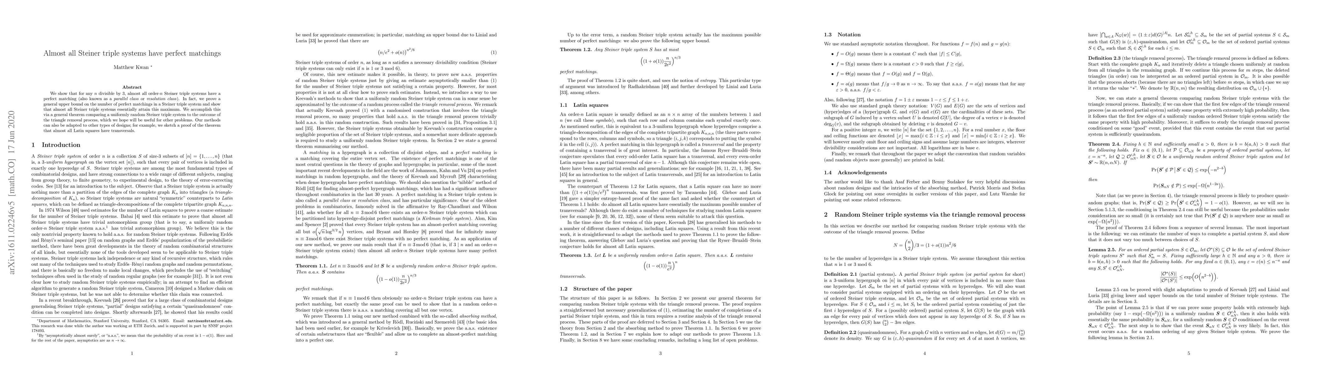 This paper demonstrates that nearly all Steiner triple systems of order n (where n is divisible by 3) contain perfect matchings, proving an upper bound on the number of such matchings and showing that most systems achieve this maximum. The authors' methods, which compare random Steiner triple systems to the triangle removal process, may also apply to other combinatorial designs, as illustrated by a related result on Latin squares.