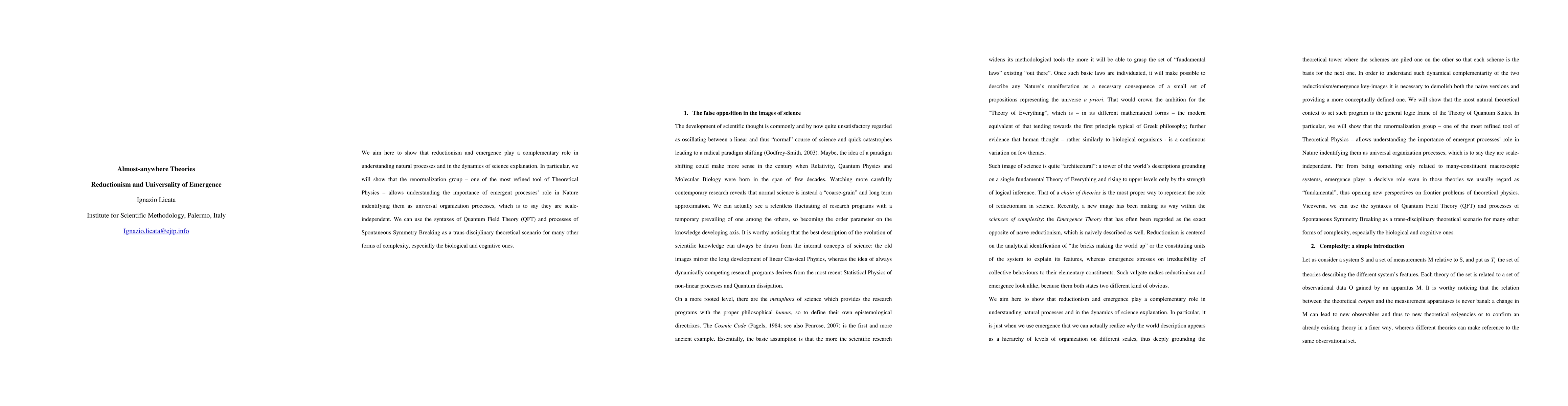 We aim here to show that reductionism and emergence play a complementary role in understanding natural processes and in the dynamics of science explanation. In particular, we will show that the renormalization group - one of the most refined tool of theoretical physics - allows understanding the importance of emergent processes' role in Nature identifying them universal organization processes, which is to say they are scale independent. We can use the syntaxes of Quantum Field Theory (QFT) and Spontaneous Symmetry Breaking as a trans-disciplinary theoretical scenario for many other forms of complexity, especially the biological and cognitive ones.