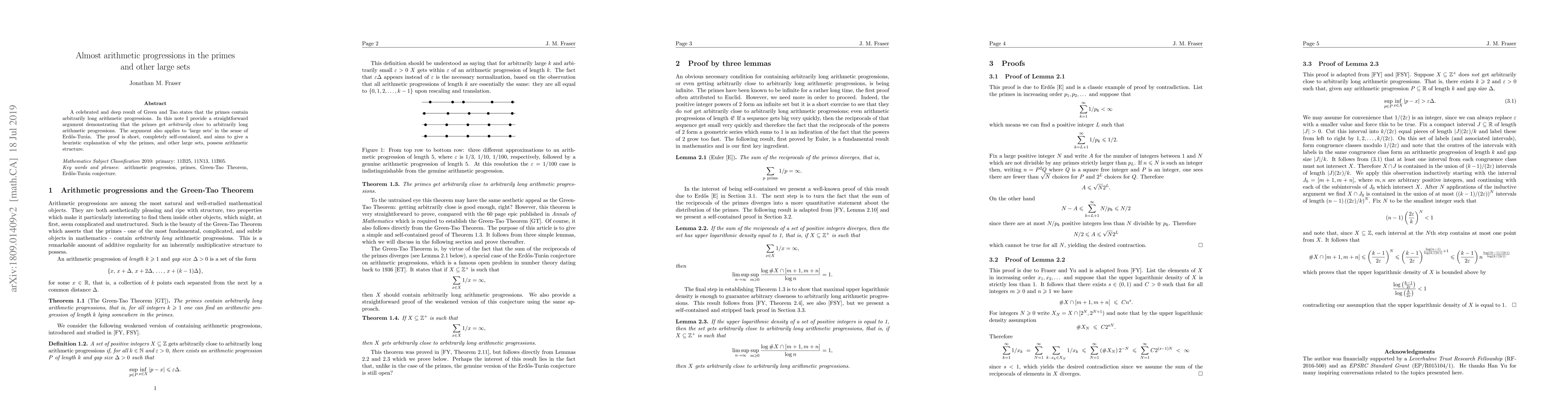 Summary: This paper presents a simple argument showing that primes and large sets exhibit near-arithmetic progressions, extending Green and Tao's result on long arithmetic progressions in primes. The proof aims to provide a heuristic explanation for the arithmetic structure found in these sets.