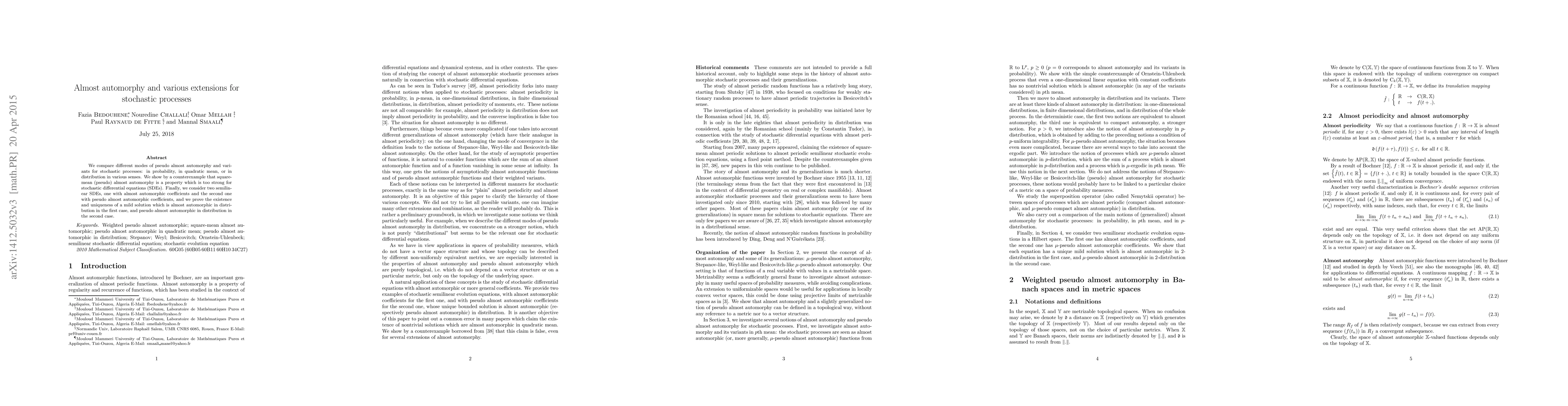 We compare different modes of pseudo almost automorphy and variants for stochastic processes: in probability, in quadratic mean, or in distribution in various senses. We show by a counterexample that square-mean (pseudo) almost automorphy is a property which is too strong for stochastic differential equations (SDEs). Finally, we consider two semilinear SDEs, one with almost automorphic coefficients and the second one with pseudo almost automorphic coefficients, and we prove the existence and uniqueness of a mild solution which is almost automorphic in distribution in the first case, and pseudo almost automorphic in distribution in the second case.