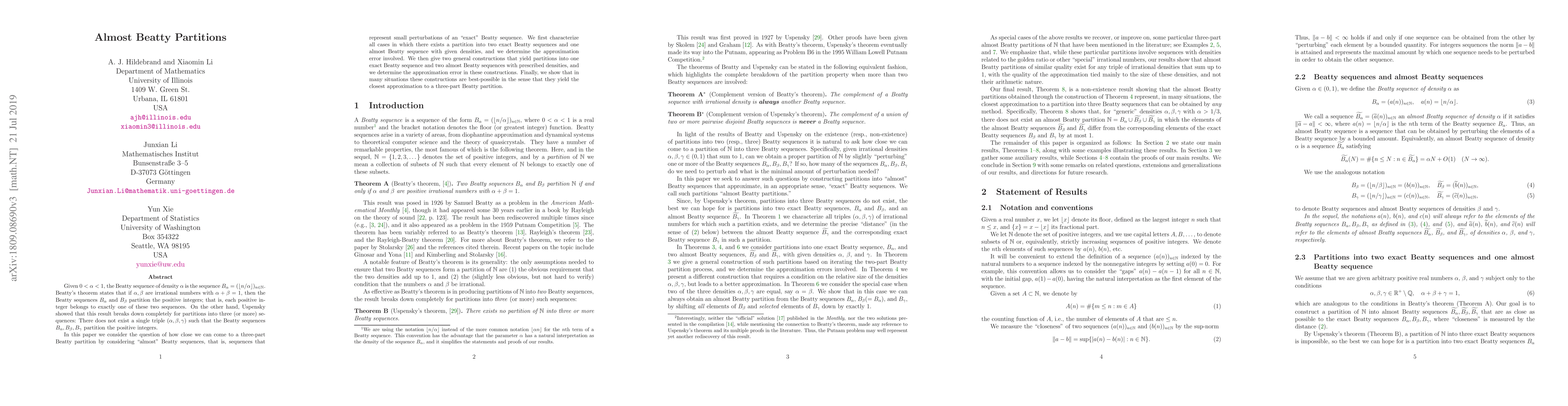 Given $0<\alpha<1$, the Beatty sequence of density $\alpha$ is the sequence $B_{\alpha}=(\lfloor n/\alpha\rfloor)_{n\in\mathbb{N}}$. Beatty's theorem states that if $\alpha,\beta$ are irrational numbers with $\alpha+\beta=1$, then the Beatty sequences $B_{\alpha}$ and $B_{\beta}$ partition the positive integers, that is, each positive integer belongs to exactly one of these two sequences. On the other hand, Uspensky showed that this result breaks down completely for partitions into three (or more) sequences: There does not exist a single triple $(\alpha,\beta,\gamma)$ such that the Beatty sequences $B_\alpha,B_\beta,B_\gamma$ partition the positive integers. In this paper we consider the question of how close we can come to a three-part Beatty partition by considering "almost" Beatty sequences, that is, sequences that represent small perturbations of an "exact" Beatty sequence. We first characterize all cases in which there exists a partition into two exact Beatty sequences and one almost Beatty sequence with given densities, and we determine the approximation error involved. We then give two general constructions that yield partitions into one exact Beatty sequence and two almost Beatty sequences with prescribed densities, and we determine the approximation error in these constructions. Finally, we show that in many situations these constructions are best-possible in the sense that they yield the closest approximation to a three-part Beatty partition.