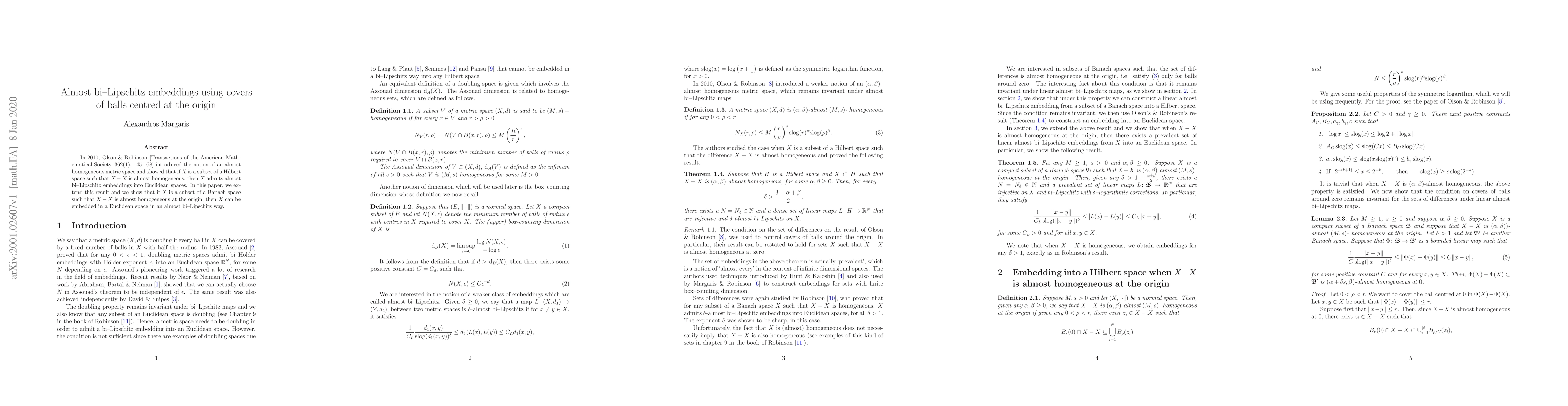 This paper extends the concept of almost bi-Lipschitz embeddings from Hilbert spaces to Banach spaces, showing that subsets with almost homogeneous differences at the origin can be embedded almost bi-Lipschitz into Euclidean space. This builds on the foundational work by Olson and Robinson in 2010.