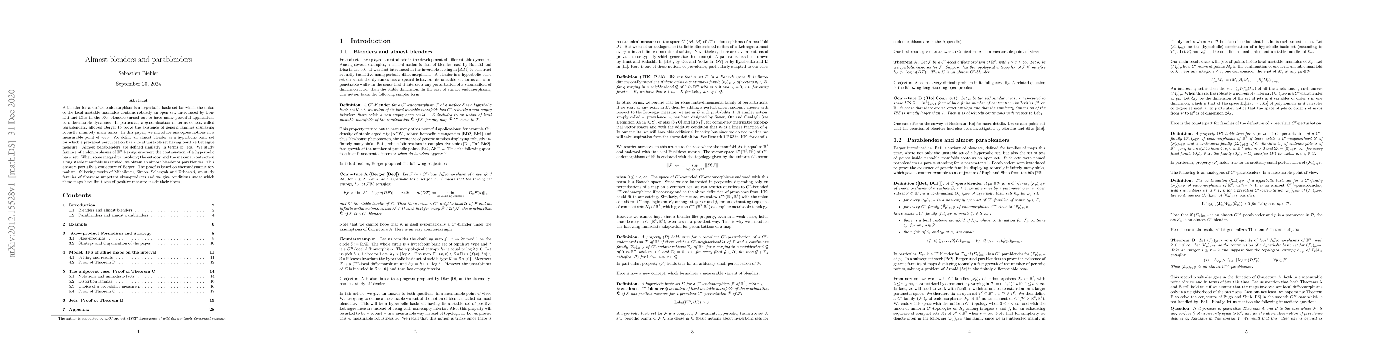 A blender for a surface endomorphism is a hyperbolic basic set for which the union of the local unstable manifolds contains robustly an open set. Introduced by Bonatti and D{\'i}az in the 90s, blenders turned out to have many powerful applications to differentiable dynamics. In particular, a generalization in terms of jets, called parablenders, allowed Berger to prove the existence of generic families displaying robustly infinitely many sinks. In this paper, we introduce analogous notions in a measurable point of view. We define an almost blender as a hyperbolic basic set for which a prevalent perturbation has a local unstable set having positive Lebesgue measure. Almost parablenders are defined similarly in terms of jets. We study families of endomorphisms of R2 leaving invariant the continuation of a hyperbolic basic set. When some inequality involving the entropy and the maximal contraction along stable manifolds is satisfied, we obtain an almost blender or parablender. This answers partially a conjecture of Berger. The proof is based on thermodynamic formalism: following works of Mihailescu, Simon, Solomyak and Urba{\'n}ski, we study families of fiberwise unipotent skew-products and we give conditions under which these maps have limit sets of positive measure inside their fibers.
