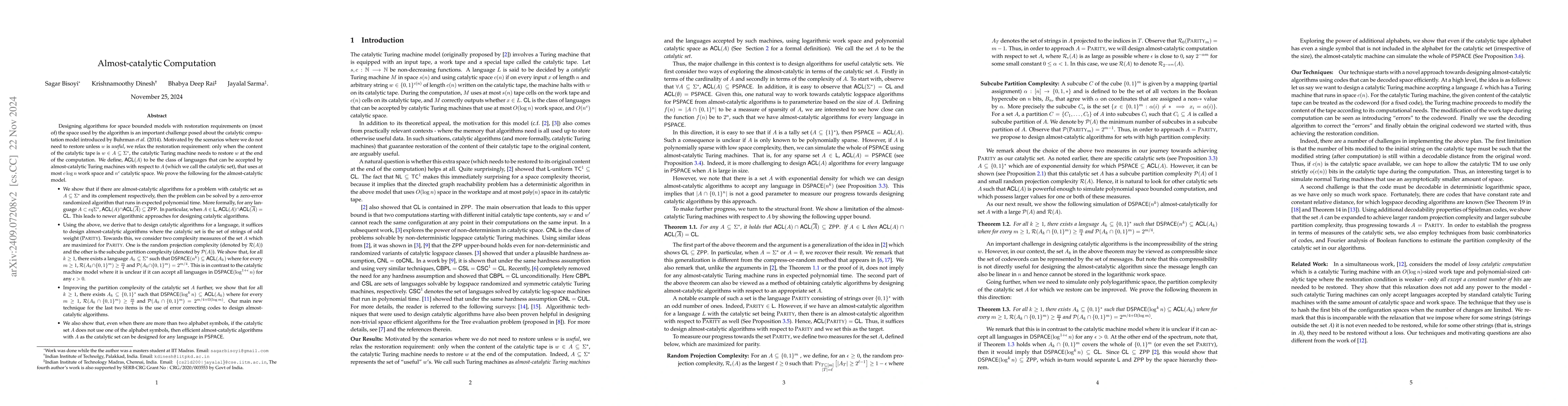 This research introduces the concept of almost-catalytic Turing machines, defining $ACL(A)$ for languages accepted by these machines with limited workspace and catalytic space. It demonstrates that if such machines exist for a problem and its complement, the problem can be solved in ZPP, and shows that designing almost-catalytic algorithms with the catalytic set as PARITY is sufficient for catalytic computation. The study also presents complexity measures for catalytic sets and establishes containment relations between $DSPACE$ classes and $ACL$ classes.