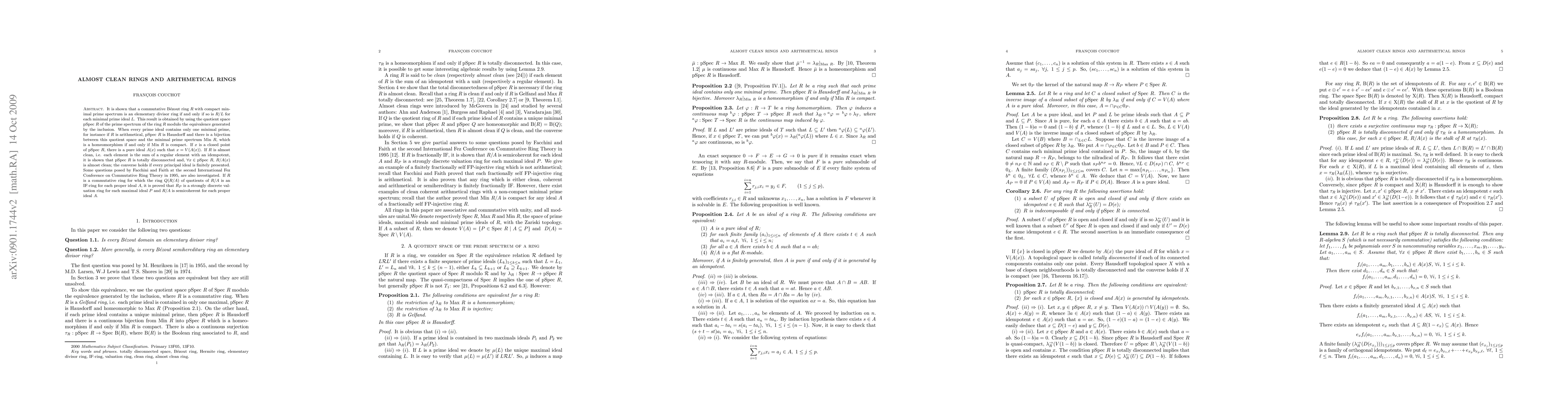 It is shown that a commutative B\'ezout ring $R$ with compact minimal prime spectrum is an elementary divisor ring if and only if so is $R/L$ for each minimal prime ideal $L$. This result is obtained by using the quotient space $\mathrm{pSpec} R$ of the prime spectrum of the ring $R$ modulo the equivalence generated by the inclusion. When every prime ideal contains only one minimal prime, for instance if $R$ is arithmetical, $\mathrm{pSpec} R$ is Hausdorff and there is a bijection between this quotient space and the minimal prime spectrum $\mathrm{Min} R$, which is a homeomorphism if and only if $\mathrm{Min} R$ is compact. If $x$ is a closed point of $\mathrm{pSpec} R$, there is a pure ideal $A(x)$ such that $x=V(A(x))$. If $R$ is almost clean, i.e. each element is the sum of a regular element with an idempotent, it is shown that $\mathrm{pSpec} R$ is totally disconnected and, $\forall x\in\mathrm{pSpec} R$, $R/A(x)$ is almost clean; the converse holds if every principal ideal is finitely presented. Some questions posed by Facchini and Faith at the second International Fez Conference on Commutative Ring Theory in 1995, are also investigated. If $R$ is a commutative ring for which the ring $Q(R/A)$ of quotients of $R/A$ is an IF-ring for each proper ideal $A$, it is proved that $R_P$ is a strongly discrete valuation ring for each maximal ideal $P$ and $R/A$ is semicoherent for each proper ideal $A$.