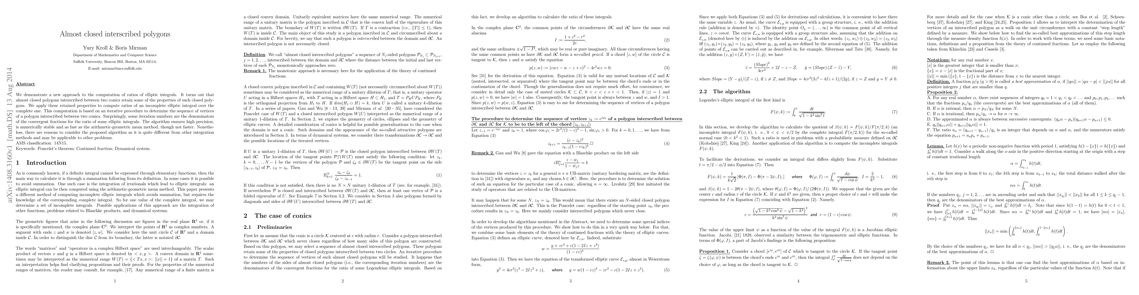We demonstrate a new approach to the computation of ratios of elliptic integrals. It turns out that almost closed polygons interscribed between two conics retain some of the properties of such closed polygons. We apply these retained properties to compute ratios of an incomplete elliptic integral over the complete one. This computation is based on an iterative procedure to determine the sequence of vertices of a polygon interscribed between two conics. Surprisingly, some iteration numbers are the denominators of the convergent fractions for thye ratio of some elliptic integrals. The algorithm ensures high precision, is numerically stable and as fast as the arithmetic-geometric mean method, though not faster. Nonetheless, there are reasons to consider the proposed algorithm as it is quite differentfrom other integration methods and may be applicable to other problems.